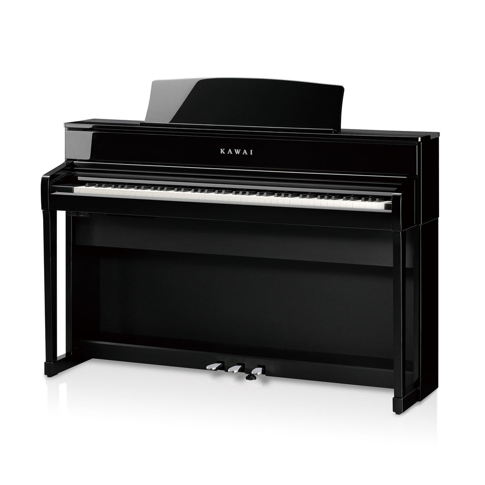 Introducing the Kawai CA-701 Digital piano A new Concert Artist piano series designed by Kawai to encourage players to become more accomplished pianists using an instrument that captures the essence of playing a concert grand piano. As soon as the player sits down, they are greeted by the instrument's flat fascia and tall upper board which immediately gives them the impression of a grand piano Available in a choice of four attractive cabinet finishes: Premium rosewood, satin black, satin white and ebony polish, musicians are permitted to coordinate with a range of modern interiors and choose a piano that works for them and fits with their home aesthetic. The combination of both traditional and modern design elements reflects Kawai's rich acoustic piano heritage, while developing the latest instruments with technology to maximise their potential One of the features included in the new Kawai CA-701 is the triple sensor key detection system for enhanced playing realism. The added third sensor improves responsiveness when playing the same key repeatedly and allows the sound of a single note to be gradually 'layered' without the previous tone being lost. This differs to the conventional two sensor keyboard actions which are found in most digital pianos. Grand piano feel With all 88 keys crafted entirely from long pieces of wood and finely textured ivory and ebony like surfaces applied to absorb moisture and assist control, the exceptional touch resembles that of a grand piano. Each of the wooden keys pivot smoothly on a balance pin and the ends rise and fall to replicate the familiar 'seesaw' motion of an acoustic piano. To further enhance the grand piano feel of the CA-701, the pedal system accurately replicates the position and individual weighting of the damper, soft and sostenuto pedals on a concert grand piano. It is also possible to adjust the half-pedal sensitivity of the damper pedal, and effectiveness of the soft pedal using the Virtual Piano Artisan parameters. This allows experienced pianists to match their individual pedalling style by personalising the instrument's response to what suits them. High quality and rich sound technology An excellent selection of additional instruments are available to choose from including electric pianos, drawbar or church organs and more! This will help you to add great variety to your performances. The dual playing feature also allows for multiple sounds to be used and played at the same time, such as grand piano and strings, which help create a more richer tone. There is also a split and four hands modes divide the keyboard into two independent sections with separate sounds for each. These latest Concert Artist digital pianos include a great sounding speaker system that has been specially designed to produce a deep bass and crisp treble frequencies. The lower range frequencies are are delivered through the underside of the instrument with the mid and high frequencies being p[projected outward via top-mounted speakers. With this feature, a resonating tone is produced that closely mirrors the immersive sound field of an acoustic grand piano. A modern and classic design The CA-701 cabinet design combines, sharp stylish lines, balanced rounded edges and elegantly tapered support legs to create a modern looking piano that will fit in any home aesthetic. You can choose from the four available finishes and choose the one that works best for you. The taller and thinner body occupies less space than previous models that Kawai have made and helps to contribute to the piano's light character, yet it retains the classic wooden tone that give a sense of stability to the piano. Ideal for progressing musicians to improve further An included feature is the MP3/WAV playback and record which allows for musicians to learn chords or melodies for new pieces, or just play along with their favourite songs. It is even possible to record and entire piece and send it to your friends or family or to simply listen to away from the piano. To further improve and develop piano skills, this piano also features traditional finger exercises, scales, and warm-up drills as well as including companion books for all classical scores to further aid your piano development over time. Stream and learn with Bluetooth connectivity The included Bluetooth connectivity and audio technologies allow for this piano to connect to smart devices wirelessly. Once it is paired with a phone, tablet or a laptop, pianists can enjoy a wide range of music-related apps, stream audio from songs directly through the speakers and further enhance their playing and learning experiences without needing to connect additional cables. Record and save songs using the USB connectivity In addition to wireless functionality, the CA-701 is also equipped with USB ports which allow musicians to connect the piano directly to a computer for MIDI use or alternatively load and save data onto a USB memory device. The USB to device functionality allows you to record your music and store it safely within an internal memory to be safely preserved on USB flash drives. Standard MIDI files can also be downloaded from the internet and played back using the instrument's harmonic imaging XL sounds without any additional hardware or cables. Audio SampleSK-EX Competiton Grand, Prelude in C-sharp minor, Op. 3, No. 2 (Rachmaninoff) Your browser does not support the audio tag.SK-EX Competiton Grand, Polonaise in A-flat major, Op. 53 (Chopin) Your browser does not support the audio tag.Industry leading grand piano feel with wooden keyboard action, Ebony and ivory touch key surfaces, 3 sensor, let-off, counterweights, High performance speaker system with 360 ° speaker diffuser panels, MP3 playback, record and overdub to USB, Latest Bluetooth MIDI and Audio v5 wireless connectivity, Premium audio processing and amplification technology