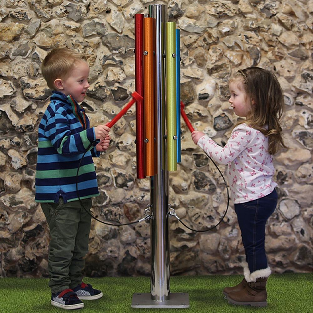 Introducing the Percussion Play penta postThis colourful cluster of five rainbow-coloured chimes features pentatonic tuning in C Major (C5-C6), which means that there are no wrong notes. With a compact design, this great sounding instrument is perfectly suited for small hands to play. It comes with attached beaters, which help children develop hand strength and dexterity. Plus, the vibrantly coloured bars are assigned to a rainbow scale, making it fun and easy to play alongside Percussion Play’s other rainbow instruments.Expertly crafted, these chimes produce a bright and soothing sound that encourages creativity and musical exploration. The penta post is suitable for any early years play setting, such as pre-schools, playgrounds, sensory play areas, and more.Get everyone involvedThis inclusive play equipment provides fun for players of any age or ability. It supports SEND learning by helping to improve hand-eye coordination, listening skills, and motor skills in an interactive and engaging way. The stand is also designed to be at the right height for young children, making it easy for them to join in.Built for outdoor useThe Percussion Play penta post is built from durable, weather-proof materials that perform well in even the most challenging outdoor environments. Each chime is securely attached to a single, thick metal post, ensuring sturdiness and longevity.Excellent warranty providedPercussion Play's manufacturing processes are consistently of the highest quality, and on top of that they offer unrivalled warranties on their products:Limited 25 Year Warranty - on metalwork used in the supporting structure of stands and frames, against structural failure caused by deterioration due to exposure to weather or by defective materials or workmanship.Limited 10 Year Warranty - on timber, composite, aluminium and stainless steel components (includes notes and fixings), against structural failure caused by deterioration due to exposure to weather or by defective materials or defective workmanship.Limited 2 Year Warranty - on mallets and other components used in the initiation of percussive sound on Percussion Play instruments.NB: These Limited Warranties do not include fading of colours, damage due to excessive wear and tear, vandalism, or negligence.Surface mounted vs Ground installThere are two ways to install this Percussion Play product:Surface mountedThe leg is attached to a base plate, which is then fixed into the ground using anchors. This provides a brilliant level of stability, whilst making it possible to move the product around with relative ease.Ground installThe leg is directly embedded into the ground, providing excellent, long-lasting stability. However, once placed, the instrument will be very hard to move - perfect for permanent installations.Installation instructions included below.Installation instructionsGround install instructionsSurface mount instructionsVibrant and compact cluster of five rainbow-coloured chimes, Inclusive play instruments, perfect for all ages and abilities, Produces bright and beautiful melodies with great resonance (C5-C6), Securely mounted onto a durable stainless steel post, Perfect for outdoor use in playgrounds and sensory gardens, Pentatonic tuning ensures there are no wrong notes