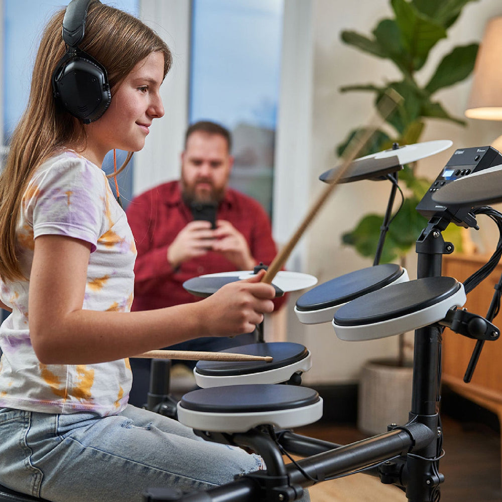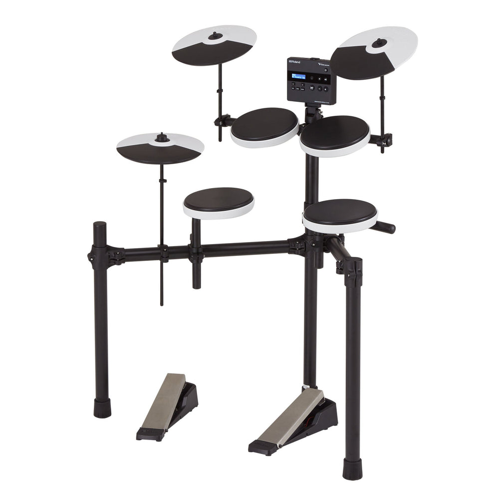 Introducing the Roland TD-02K V-Drums electronic drum kit Every element of this drum kit has been designed to form a complete, solid musical foundation, with world-class drum sounds and highly responsive sounds, this drum kit is a great option for young drummers, students who need a reliable practice kit or adults who want to get back into drumming. With features such as a built in metronome, Bluetooth connectivity and onboard coach functions for guided practice and skill development, this drum kit is perfect for any student or beginner who wants to progress further with their skills. Please note: Drum sticks, drum throne and headphones are not included. Noise-reducing design features Electronic drums are far quieter than acoustic drums and to take this one step further, V-drums are much quieter than other electric drum kits. This is thanks to the innovative noise-reduction features which Roland have designed for their kits. The hi-hat controller and kick pedals in the TD-02 series come with sound absorption designed to contain noise transfer which can sometimes carry through to adjoining rooms via the floor. Develop your technique by playing along with video lessons Those who are looking to develop their technique and progress further as a drummer can use the stereo audio input and connect their smartphone. Players are able to drum along with their favourite bands through headphones. This is also a great way to work through instructional drumming videos on the web. Whether you are learning on your own or studying with a drum instructor, the practice features that come with Roland's V-drums help you to improve technique. These features include a metronome complete with different rhythm subdivisions, sound options and an LED flash. What's in the box? As well as the drum kit itself, there is an included setup guide and leaflet which informs you how to set up and operate the drum kit safely. An AC adaptor is also included so you can plug in and play as soon as you have set up your kit The special connection cable and drum key will also allow you to fix the drums so they suit you and your playing style. It includes everything you will need to ensure you make the most out of your electronic drum kit. High-quality electronic drum kit for all levels, Authentic V-Drums sound, expression and playability, Featuring world-class sounds and highly responsive pads, Practical features for reducing noise when playing at home, The most compact kit in the series, *Drum sticks, drum throne and headphones not included
