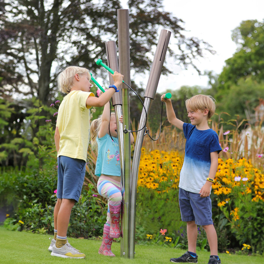 Introducing the Percussion Play A-minor cattails - set of 3Whether you call them cattails, reeds or bullrushes, these sleek chimes are instantly recognisable as the slender marsh plant with tall stems and dark brown velvety heads.Great for playful interactions along nature trails, in parks or in woodlands, citizens can stop and enjoy a moment of musical mindfulness while exploring the great outdoors. Built from light bronze cylindrical adonized aluminium and attached to stainless steel 'stems', the instrument is durably built and made to withstand harsh conditions outdoors.Sent with two different end caps to choose from, the closed end cap gives a flush finish, while the pointed end caps replicate the staminate of the cattail. Both will prevent debris from entering the chime and affecting the sound produced, while still blending in seamlessly with nature.Mindful, relaxing soundThe chimes produce a soothing, mellow sound when struck with the small, soft green mallets arriving with the instrument. This makes the Percussion Play cattail the perfect mindful addition to any outdoor public space.Excellent warranty providedPercussion Play's manufacturing processes are consistently of the highest quality, and on top of that they offer unrivalled warranties on their products:Limited 25 Year Warranty - on metalwork used in the supporting structure of stands and frames, against structural failure caused by deterioration due to exposure to weather or by defective materials or workmanship.Limited 10 Year Warranty - on timber, composite, aluminium and stainless steel components (includes notes and fixings), against structural failure caused by deterioration due to exposure to weather or by defective materials or defective workmanship.Limited 2 Year Warranty - on mallets and other components used in the initiation of percussive sound on Percussion Play instruments.NB: These Limited Warranties do not include fading of colours, damage due to excessive wear and tear, vandalism, or negligence.Surface mounted vs Ground installThere are two ways to install this Percussion Play product:Surface mountedThe leg is attached to a base plate, which is then fixed into the ground using anchors. This provides a brilliant level of stability, whilst making it possible to move the product around with relative ease.Ground installThe leg is directly embedded into the ground, providing excellent, long-lasting stability. However, once placed, the instrument will be very hard to move - perfect for permanent installations.Installation instructions included below.Installation instructionsGround install instructionsSurface mount instructionsSleek chimes, instantly recognisable as the cattail plant, Perfect for playful interactions in parks and nature trails, promoting musical mindfullness, Produces a mellow and soothing sound, Light bronze cylindrical adonized aluminium chimes, Features small, soft green mallets, Arrives with both closed-end caps and pointed end caps