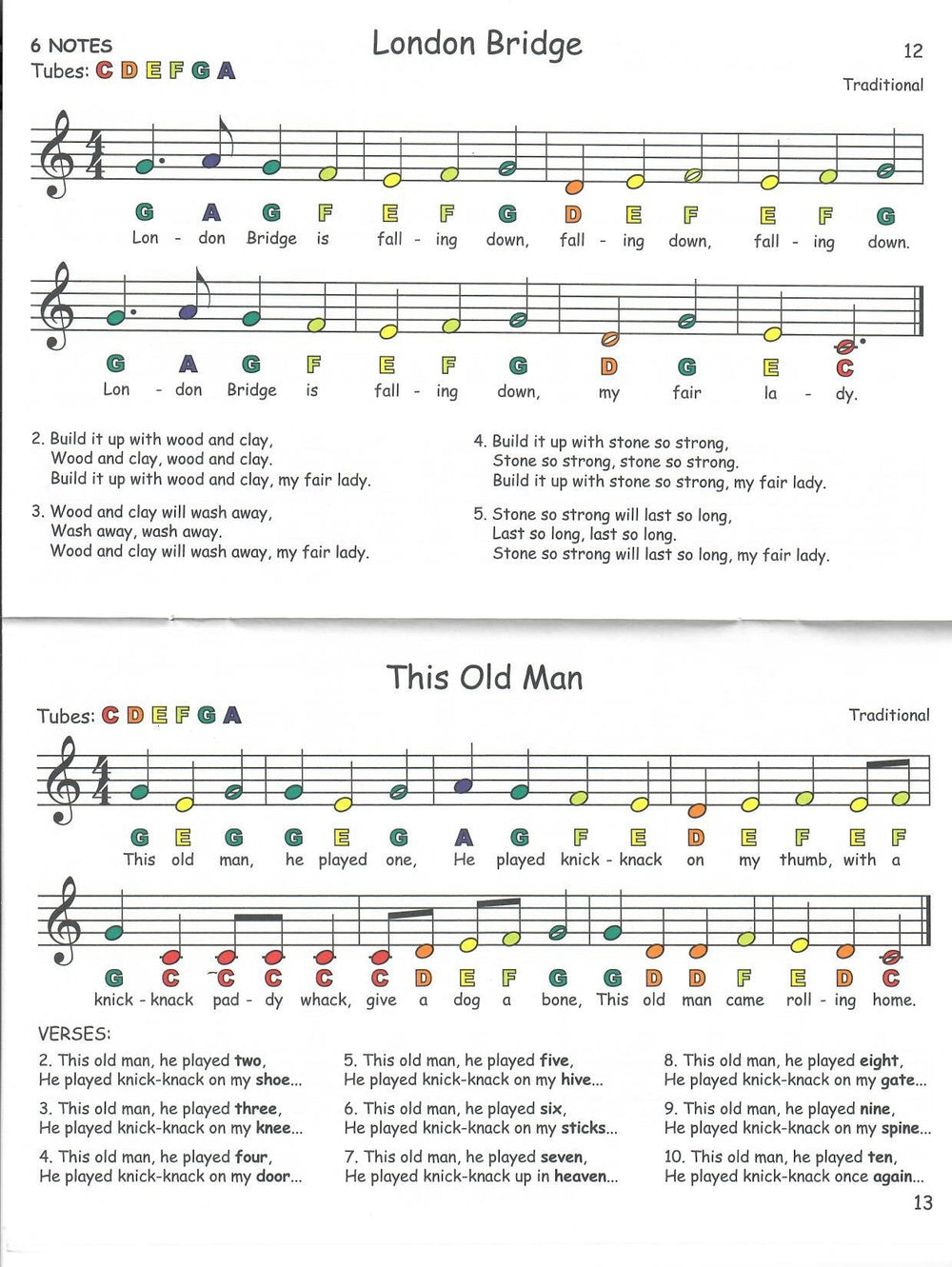 The musical notes in these songbooks are colour-coded to match the tubes according to Boomwhackers’ Chroma-Notes™ Coloured Music System. The coloured notes enable anyone to easily play and learn about about reading music at the same time. One person can play the songs or several people can each have one or two tubes and play their notes as needed – a great family or group activity! Contains 19 familiar children’s songs and one original song.The book is designed to help children easily learn to play songs in the C Major Diatonic Scale (like a piano's white keys).The notes of the songs are labelled to help reinforce note-reading.Colour coded children's songs, Songs for C Major Diatonic Scale, , , ,