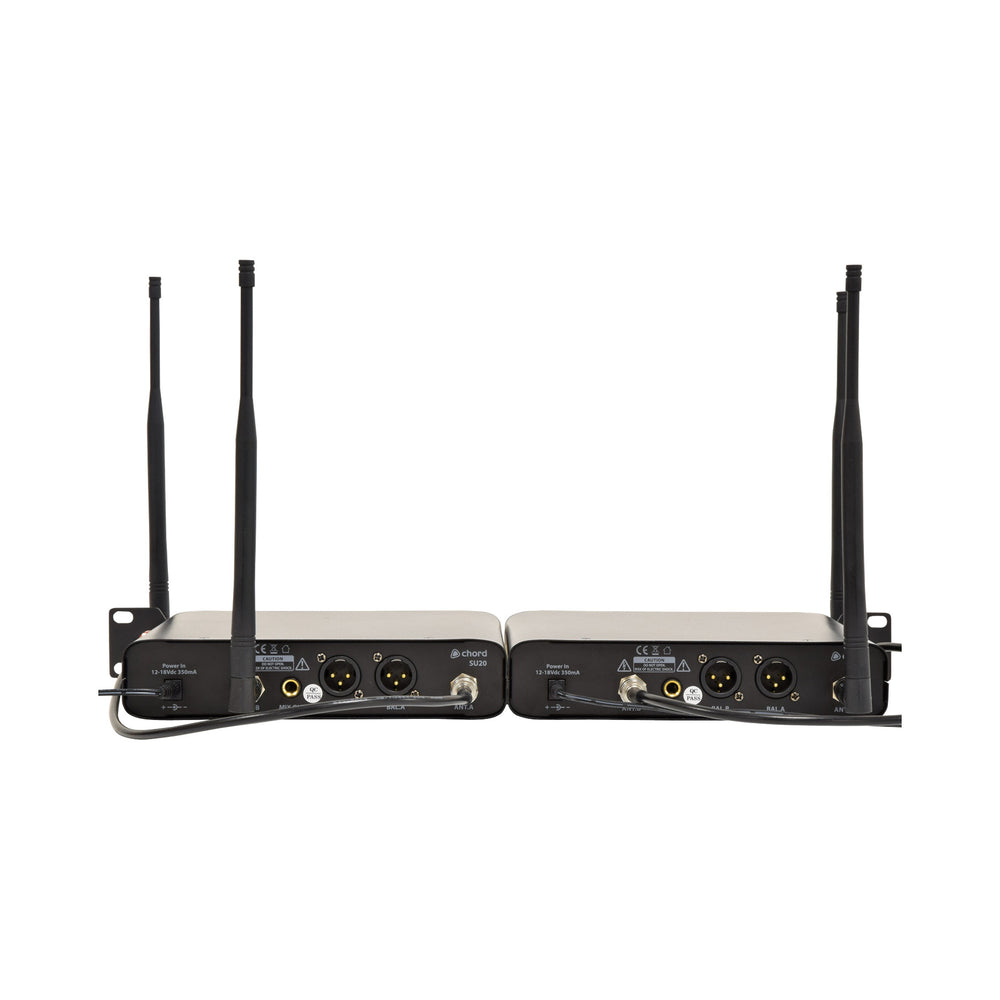 Introducing the Chord SU20 2-channel wireless microphone setPerfect for live speech and entertainment, the Chord dual UHF wireless microphone systems comes with 2 handheld mics, each with a transmitter powered by 2 x AA batteries. It’s got an impressive range of 60 metres, and it provides all the functionality of a dual UHF system in a compact half-rack format, making it ideal for environments where space is important.The output is provided individually on balanced XLR connectors, or mixed to a single 6.3mm jack socket for connecting to an amplifier, mixer or active speaker.This set is available in two different carrier frequency options: 863.42MHz (Red) + 864.3MHz (Green) or 864.8MHz (Blue) + 863.1MHz (Yellow)What's in the box?SU20 half-rack dual UHF receiver1 x short rack ear1 x long rack ear1 x coupling plate for 2 receivers2 x BNC antennas2 x BNC antenna extension leads2 x handheld transmitters14Vdc 350mA power adaptor6.3mm jack leadMore useful informationInstruction manualUltra-compact dual microphone set, Perfect for live speech and entertainment, Featuring front or rear mountable antennas, Balanced XLR connectors and single 6.3mm jack socket, Up to 2 sets (4 microphones) can be used together, Supplied with power adaptor and 4 x AA batteries