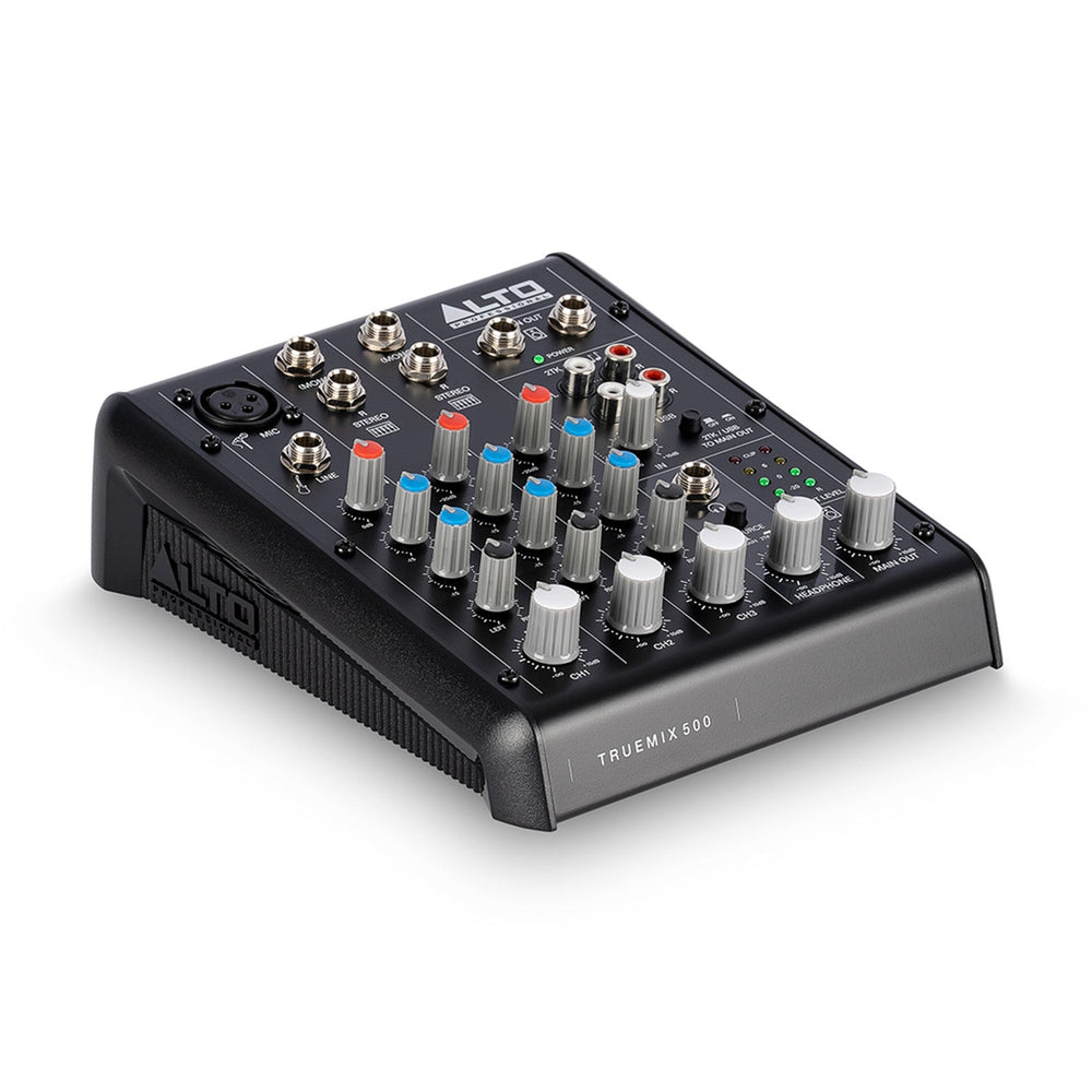 Introducing the Alto TrueMix 500 5-channel analogue mixerThis simple to use analogue mixer with USB can be used on a variety of applications. The built-in stereo USB audio interface delivers all the essential features you will need for home recording, livestreaming, podcasting or performing. Whatever you need, this mixer has got you covered.The small and lightweight design means that you can take your mixer with you and make music on the go. Connecting to your computer is also fast and easy with the plug and play connectivity on Windows and macOS, making it the perfect fit for anyone who wants and easy audio-mixing experience with the potential to record on the go.Perfect inputs for your line level audio sourcesThe TrueMix 500 has five analogue inputs with high-headroom circuitry for minimal noise and clipping in your signal so you can produce a clear sound. The Mic input channel is great for anyone who wants to connect a dynamic or condenser mic that requires phantom power so the audio remains clear.There are also two stereo input channels, each with dual balance 1/4" TRS inputs which are perfect for your line level audio sources.Maximum controlEvery channel on the TrueMix500 features a two-band EQ with colour coded knobs which make dialling in your perfect sound, easy and efficient, even in low-light situations. Simply plug your new mixer into your computer and start creating your own sounds.Our Alto TrueMix rangeAlto TrueMix 500 5-channel analogue mixer with USBAlto TrueMix 600 6-channel analogue mixer with USB and BluetoothAlto TrueMix 800 FX 8-channel analogue mixer with USB and BluetoothCompact 5-channel analogue mixer with USB I/O for audio playback and stereo recording, 1/4†main, tape, and headphone outputs, Mic input channel with 18V phantom power and balanced line input, Two stereo input channels with balanced 1/4†TRS jacks, Two-band EQ on all channels, 2-track inputs w/ assignable routing: main mix or headphone out