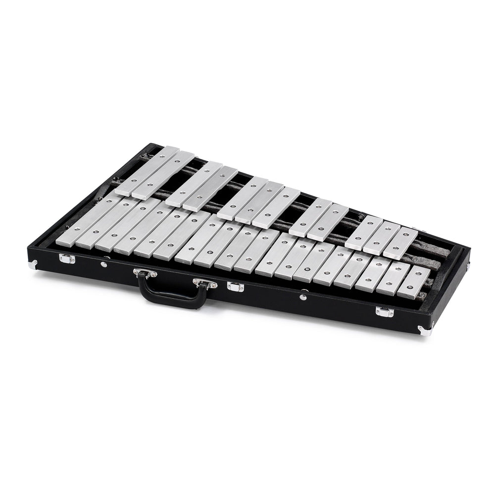 Introducing the Majestic Concert 2.5 octave glockenspiel The B3125S glockenspiel from Majestic features 32mm steel bars providing a bright tone that projects through any full ensemble sound, yet still sounds sweet even when played at its softest. With a range of 2.5 octaves (G5 to C8), it is suitable for a great selection of repertoire for orchestra, wind band, solo performance, percussion ensemble, and more. The glockenspiel is set in a high quality black wooden case which not only looks professional, but is also the ultimate protection for the instrument when in transport. A particularly deep case construction, this enables increased resonance and sustain of each note. Majestic Concert glockenspiels feature the innovative dual pin mounting that provides great stability to the bars, available in either steel or aluminium. About Majestic Majestic is a brand of thoughtfully designed instruments for the professional, the educator, and today’s percussion student utilising carefully constructed ideas born from both traditional percussion instrument heritage and a culture of innovation. The family firm was founded in 1921, supplying organs, pianos and wind instruments with the production of percussion following shortly after. In 1960 the Majestic brand name was introduced, starting with drum kits which were prevalent among rock bands in the Netherlands. Orchestral and marching percussion soon became the corner stone of the brand, with timpani, marching drum and tuned percussion becoming areas of speciality for Majestic. To this day product development, engineering, and production are overseen by family members and every model must adhere to stringent standards of craftsmanship and performance. Please note: all large tuned percussion instruments such as xylophones, marimbas, and vibes etc. are delivered boxed and require assembly.2.5 octave glockenspiel for advancing percussionists, Double pin bar mounting for extra stability, High quality 32mm aluminium or steel bars, Range: G5-C8, A=442Hz, Smart, deep wooden case for increased resonance and sustain