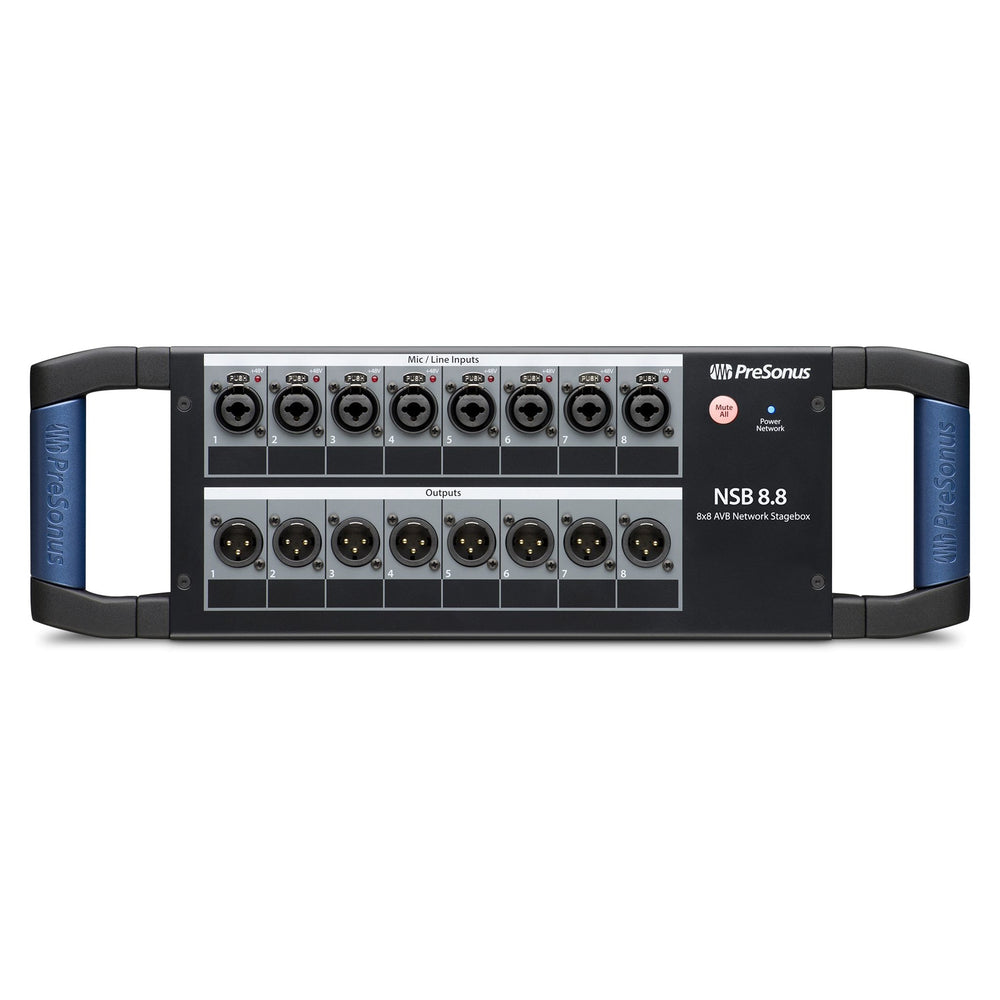 Introducing the PreSonus NSB8.8 network stage boxThe PreSonus ® NSB 8.8 networked stage box lets you put your analog I/O for your StudioLive ® Series III digital mixer wherever you need it. Equipped with eight digitally controlled XMAX mic preamps, eight balanced line-level inputs, and eight analog outputs, the NSB 8.8 integrates seamlessly into StudioLive Series III digital mixers with a single Ethernet connection. Remote control input trims, phantom power, and more directly from your StudioLive Series III console or from UC Surface remote mixing software on your tablet or laptop.The NSB 8.8 networked stage box is loaded with eight versatile locking combo jacks. Connect your microphones to the digitally controlled XMAX preamps or use the balanced ¼-inch TRS inputs to connect your line-level devices—the NSB 8.8 can handle it all. The inputs can be sent to any StudioLive Series III digital mixer on the network, and thanks to gain compensation, every mixer gets individual gain control without affecting the front-of-house mix.Rugged, durable exteriorPreSonus built the NSB 8.8 inside a rugged steel chassis with sturdy handles designed to survive the rigors of the most demanding tours. The NSB 8.8 is also install-friendly: Just remove the handles and attach the optional rackmount kit (NSB8.8-RACK), and your NSB 8.8 can be racked in your studio or backstage. For permanent installations, the NSB 8.8 is also compatible with stage pockets from Ace Backstage.A complete networked solutionStudioLive Series III networked products form an ecosystem that is easily expanded and quickly configured. Designed to enhance each other, these products are at the forefront of AVB networking technology. The NSB 8.8 can be used alone or with many other NSB-series stage boxes (NSB16.8) to add remote audio to one StudioLive Series III digital mixer or multiple mixers on the same network. For StudioLive Series III mixers that have limited onboard analog I/O, the NSB 8.8 provides a simple expansion to a full 32- or 64-channel mixing system.8x8 network stage box for StudioLive Series III console mixers, 8 digitally controlled XMAX mic/line inputs & 8 line outputs, Easy configuration from StudioLive Series III console mixers and UC Surface, Built-in 2-port AVB switch with locking Ethernet connections, Rugged all-metal stage box enclosure, Optional rack ears