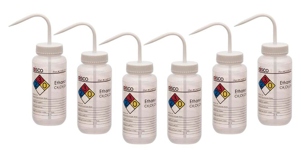 Eisco Labs Ethanol Wash Bottle, 500 mL, Wide Mouth, Pre-Labeled, LDPE (2 color), Pack of 6
