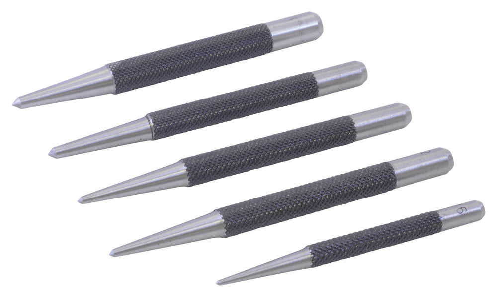 The centre punches have ground points and knurled grips.Size: 1/16" to 5/32" diameter.Pack Size: 5 piece set.