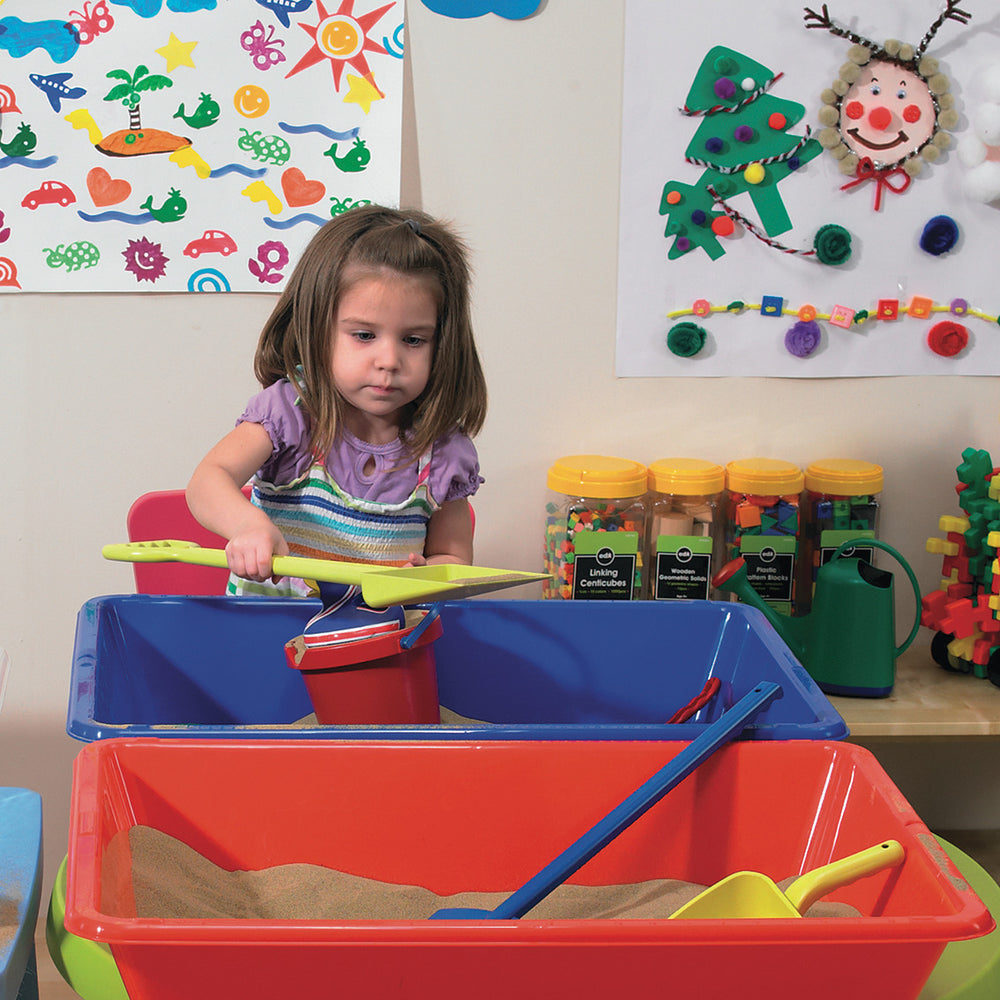 A great way for them to safely play and explore with different materials such as water, sand, paint, jelly, or any messy play mixtures of your choice. For use on a table or floor indoors, or outdoors in the garden. Have fun mixing different materials together, experimenting with colour mixing or use small items or counters for imaginative play, or just to make a potion! Trays nest for compact storage. The trays measure 500 x 700 x 150mm. Set includes: Set of 4 trays in 4 colours: red, green, yellow and blue. Suitable for age 3+ years.