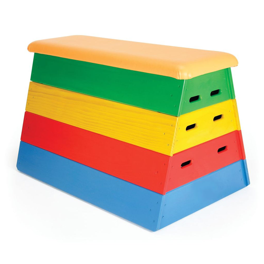 A vibrantly coloured vaulting timber box with a well padded vinyl top. Top section can be used on its own and the colour coded sections can be used to denote the height for groups of different abilities. Available in 3 section 1.34m L x 68 W (at base) x 63cm H, width: at top 42cm or 4 section 1.35m L x 80 W (at base) x 83cm H, width: at top 45cm (4 section fitted with wheeling device).