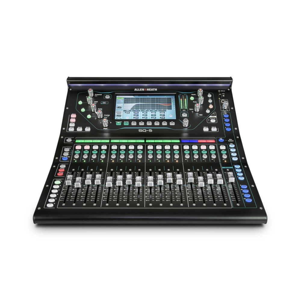 • Professional mixer with a fast and efficient workflow • 16 preamps, 16 channel faders, 12 line outputs & 8 assignable SoftKeys • Class leading high-res audio with ultra-low latency <0.7ms • SQ-Drive 96kHz USB interface for multitrack or stereo recording • 7" capacitive touch screen with rotary control and dedicated physical controls • Built to the highest standard, SQ5 is perfect for recording studios and live sound, Introducing the Allen & Heath SQ5 48-channel digital mixer With the XCVI FPGA engine at its core, the SQ5 may be small but really packs a punch. Features such as the ultra-low latency (less that 0.7 milliseconds!), compact size and powerful audio capabilities make this mixer ideal for recording studios, corporate AV, and live sound. The 7" capacitive touch screen with rotary control; dedicated physical controls for frequently accessed parameters, and 8 assignable SoftKeys create a fast and efficient workflow. Local inputs and outputs mean SQ works as a standalone desk, and the addition of the 96kHz USB interface allows quality recording and playback. Expansion is easy with the I/O port for options cards such as Dante and Waves. New to SQ, it also has an S-Link port so you can connect dSnake units, including the AR2412 and AR0804. The SQ5 includes 16 onboard preamps, 16 channel faders, and 12 line outputs. It has 8 stereo multi-effects engines built in, and is also DEEP processing ready so you can fully customise your SQ with classic preamps and compressor models. For a slightly smaller mixer, check out Allen & Heath's SQ6. A new standard in compact digital mixing 48 channel, 96kHz digital mixers for live sound, AV and installation. Powered by Allen & Heath’s revolutionary XCVI 96kHz FPGA engine, SQ is built for professionals in demanding live sound, recording and streaming applications. Delivering class-leading high-resolution audio with an ultra-low <0.7ms latency, SQ gives you unrivalled power and audio fidelity. Superbly intuitive user interface Channels and mixes can be dragged and dropped to any strip, with custom naming and colour coding on the displays, allowing you to build a mixing environment that works for you. Each strip features our patented Chromatic channel metering system, giving you at-a-glance level indication thanks to LEDs with variable brightness and colour. SQ’s dashboard is centred around a high-res 7” touchscreen, framed by an array of high-grip, illuminating encoders to create an intuitive, integrated blend of clear visual feedback and immediate, hands-on control. All SQ mixers feature SoftKeys which can be assigned to commonly used functions. The SQ-6 and SQ-7 also provide assignable Soft Rotaries for even more custom control. Powerful processing Every input has HPF, a super-fast gate with sidechain and filter, a musical 4-band parametric equaliser with RTA, and Peak/RMS compressor for control and shaping of levels and transients. Mixes have both a parametric and 28 band graphic EQ along with compressor as standard, all ready to switch in when required. World-Class FX SQ is armed with 8 stereo FX engines and comes complete with the acclaimed RackExtra library, featuring emulations of legendary classic reverbs, gated reverbs, delays, modulators and more. Every engine has its own dedicated stereo return too, so you don’t need to use up any of your 48 input channels. Record. Stream. Mix Record to USB Automatic mic mixer Built to last designed for the pro SQ5 Reference Guide SQ5 Introduction SQ5 Cutsheet SQ5 Specs SQ’s built-in 32×32 96kHz audio interface enables easy multitrack recording, backing-track playback, livestreaming and virtual soundcheck. The interface is class-compliant on Mac OS X making it truly plug ‘n play, with ASIO and WDM compatible drivers available for Windows computers. You can even map the SQ’s faders, rotaries, channel keys and softkeys to control your favourite DAW using the Allen & Heath MIDI Control app. The integrated SQ-Drive makes it quick and easy to capture and playback 16 channels (96kHz), 32 channels (48kHz), or a stereo recording of the performance direct to a USB key or drive. No software setup, no soundcard driver issues and no extra laptop to bring to the performance. SQ’s advanced automatic mic mixers (AMM’s) make it a natural choice for mixing conferences, panel talks and TV shows. They’re fully integrated in the mixer too, with no extra latency, so you don’t need to route the audio to an internal DSP rack or an external plugin system. Two fully independent 24 channel AMM’s can be utilised for two zones or combined into a single 48 channel AMM for larger events. We know that the live environment can be tough on gear – so for SQ we devised our most punishing regime of testing and retesting yet. From its 3-tier, all metal chassis to its extruded aluminium light bar, SQ has tremendous strength and rigidity underlying its good looks.