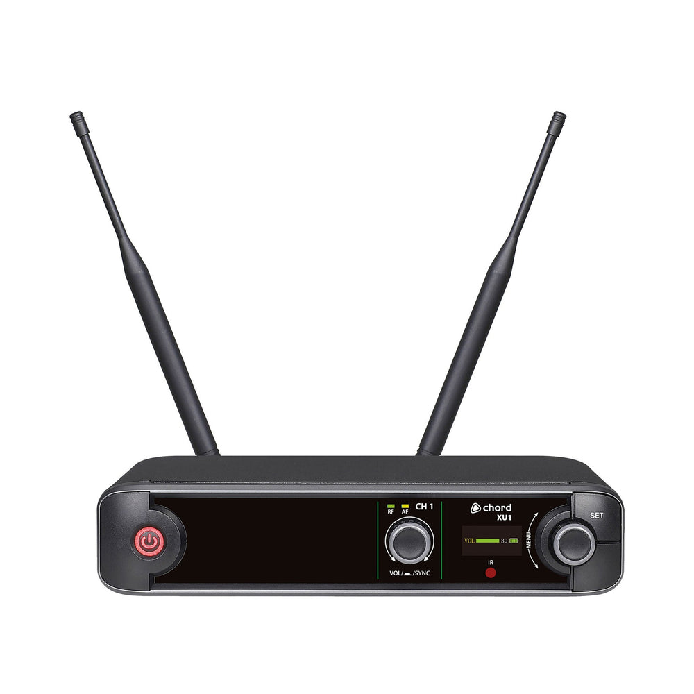 • Compact half-width rack receiver • True diversity antennas with internal distro for reliable reception • 10 groups of 9 selectable UHF carrier frequencies • Selectable backlight colours for each channel • Settings sync I.R. from receiver to transmitters • Colour TFT display for settings menu, Introducing the Chord XU series UHF wireless microphone systems XU series wireless microphone systems offer pro-level features in a compact receiver with premium microphone transmitters. Supplied as a half-width 1U rack receiver with 1, 2 or 4 channels of either handheld microphones or bodypack transmitters with a neckband and lavalier mic option. The receiver is a true diversity type with dual antennas and internal distribution for minimising dropouts. The front panel has a volume control and indicator LEDs per channel alongside a colour TFT display with level indications for each channel and settings for channel frequencies and colours. Each transmitter also has its own LCD display for frequency and battery status, with a backlight that can be set to one of 6 colours for identification. Carrier frequencies are arranged in 10 groups with carriers in both the UK/EU license-free UHF and PMSE licensed duplex gap UHF bands. Each set is supplied with hardware for mounting into a 1U rack space with extension cables to enable front mounting of the antennas. For a wireless microphone system with straightforward operation and intuitive features, the XU series delivers freedom and reliable operation to vocalists, presenters and instructors in a compact and convenient package. What’s in the box? - XU-series true diversity UHF receiver - 1, 2, or 4 bodypack transmitters with neckband & lavalier mics - 2 x UHF antennas - 2 x BNC antenna extension leads - Rack-mounting brackets for 1 or 2 receivers in a 19" 1U space - UK power adaptor - 6.3mm male to male cable - 2, 4, or 8 x AA batteries