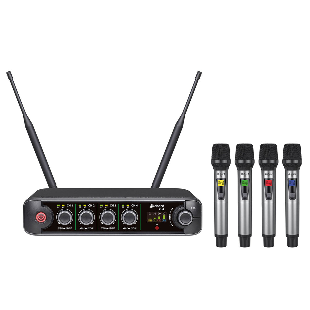 • Compact half-width rack receiver • True diversity antennas with internal distro for reliable reception • 10 groups of 9 selectable UHF carrier frequencies • Selectable backlight colours for each channel • Settings sync I.R. from receiver to transmitters • Colour TFT display for settings menu, Introducing the Chord XU series UHF wireless microphone systems XU series wireless microphone systems offer pro-level features in a compact receiver with premium microphone transmitters. Supplied as a half-width 1U rack receiver with 1, 2 or 4 channels of either handheld microphones or bodypack transmitters with a neckband and lavalier mic option. The receiver is a true diversity type with dual antennas and internal distribution for minimising dropouts. The front panel has a volume control and indicator LEDs per channel alongside a colour TFT display with level indications for each channel and settings for channel frequencies and colours. Each transmitter also has its own LCD display for frequency and battery status, with a backlight that can be set to one of 6 colours for identification. Carrier frequencies are arranged in 10 groups with carriers in both the UK/EU license-free UHF and PMSE licensed duplex gap UHF bands. Each set is supplied with hardware for mounting into a 1U rack space with extension cables to enable front mounting of the antennas. For a wireless microphone system with straightforward operation and intuitive features, the XU series delivers freedom and reliable operation to vocalists, presenters and instructors in a compact and convenient package. What’s in the box? - XU-series true diversity UHF receiver - 1, 2, or 4 handheld mics - 2 x UHF antennas - 2 x BNC antenna extension leads - Rack-mounting brackets for 1 or 2 receivers in a 19" 1U space - UK power adaptor - 6.3mm male to male cable - 2, 4, or 8 x AA batteries