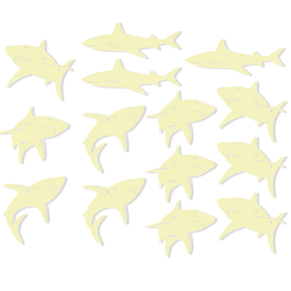 Stick these glow-in-the-dark sharks on the walls or ceiling. Fill your room with glow sharks and turn it into an undersea world. Expose the sharks to a light source for a minute. Turn off the light and watch them glow. They will glow like magic in the darkness. Recharge them and they will glow again and again. The fun is unlimited. Contains 14 sharks and adhesive tab.