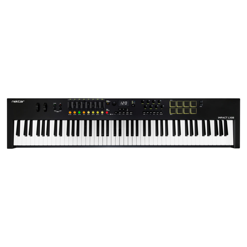 • Available in 25, 49, 61 and 88 key versions all featuring redesigned keybeds • 9 full-resolution encoders with parameter control in one rotation • 8 faders, 8 velocity sensitive pads, 9 LED illuminated buttons, 22 additional buttons • 1/4″ TS footswitch jack, USB-C connection and power • Nektar custom DAW integration for Ableton, Cubase, Logic Pro and more • Native Instruments NKS support works in any DAW, compatible with thousands of plugins, Introducing the Nektar Impact LX MK3 MIDI keyboard controller The Nektar Impact LX MK3 MIDI controller keyboards combine an expressive, redesigned keybed with 9 full-resolution encoders, 8 faders, 8 velocity sensitive pads and tons of buttons to give you instant access to performance or DAW integration features. New performance features include Scale, Chord and Hold with Nektar custom DAW integration bringing the best out of controls with innovative new features and a workflow tailored to compatible DAWs. Impact LX MK3 also supports Native Instruments NKS control standard which ensures compatibility with thousands of plugins even in DAWs not supported by Nektar DAW integration. With Impact LX MK3 the hard work is done, so you can focus on your creativity. Feel every note The newly redesigned keybed is truly worthy — smooth, responsive, and built for expressive play. With minimal friction and a firm touch, it lets you connect more deeply with your instruments. Paired with pitch bend and modulation wheels, plus a footswitch input for sustain, you’ve got everything you need to shape your sound with nuance and emotion. Effortless control at full resolution The encoders are the foundation of control and constantly in use. So their solid and precise performance is important. You get near-enough a full resolution in one rotation without skipping a step. Working seamlessly with Nektar DAW integration you get relative control which means no parameter jumping or pickup functions to worry about. Precision at your fingertips: global encoder & display feedback If you had to pick just one control, the large global encoder would be it. Offering the same benefits as the other encoders but with added precision, thanks to its larger surface, it’s your ultimate tool for fine-tuning. The best part? It works independently of mode selection and has a bunch of powerful options with Nektar DAW integration. Faders – mix or envelope control Faders provide a truly unique control experience, evoking the satisfying tactile feel of mixing or adjusting envelope parameters. On Impact LX MK3 that’s exactly what the faders are designed for. Little is left to the imagination with silkscreen added above the faders to indicate their default assignments. MIDI programming right from the board Impact LX mk3 is a MIDI controller that augment functionality with Nektar DAW integration. It’s still a MIDI controller of course and you can program controls in Preset mode directly from the hardware. In Setup mode, use the large encoder to select menu options and program MIDI messages immediately. All settings are stored over power cycling with options to additionally store in 5 presets and 8 pad maps. Build your kits, non-stop! For groove and beat creation, 8 velocity sensitive pads make life easy. Calibrated to trigger at a light touch, finger drumming is a reality, with a nice and even velocity response. The "Pad Learn" feature allows you build kits as you go. Hit a pad, play a key. It’s that easy. In fact, keep Pad Learn on and let your kit evolve with your music. Non-stop! Nektar DAW integration, customised for your DAW - Create loops or navigate your DAW using the LED buttons. - Record freely and have the looper automatically create your loop. - Click any parameter and control it instantly. Nektar DAW integration is beyond anything you have seen before. Innovative new features builds on our previous work and give you the best possible workflow with your DAW. With Nektar DAW integration you can: - Full mixer control including channel volume, pan, sends, mute and solo. - Control plugin instruments. - Seemless switch to NKS control on track selection. - Navigate tracks and DAW functions. Nektar custom DAW integration is designed for Ableton Live Suite (11 or higher), Bitwig Studio 5 (or higher), Cakewalk/Sonar, Cubase (13 or higher), FL Studio, Garageband, Nuendo, Logic Pro (10.8 or higher), Reason, Reaper and Studio One (5 or higher). Find out more about Nektar's DAW integrations here. Impact performance tools The Impact LX MK3 offers powerful performance tools that benefit both beginners and advanced players. Features like the Scale function allow musicians to explore adventurous melodic ideas without constant concern for key choices. With Scale acting as a creative safety net, notes are kept neatly within the chosen scale. Keep it within the Scale Even for experienced players, the Scale function provides comfort by ensuring you’re unlikely to play a “wrong” note. If a key is played outside the selected scale, it’s automatically adjusted to play the nearest note within the scale. This isn’t just useful; it’s incredibly fun! Experiment with chromatic runs and discover unique note re-triggering patterns you’d likely never achieve without Scale mode. Crafting Chords and intervals Whether you’re a chord expert or just starting, the LX MK3’s built-in Chord function offers endless inspiration. Think of it as an advanced interval feature that allows you to trigger more notes than your fingers press.You can play octaves, 3rds, or 5th harmonies, and even add a sub-octave (-1 or -2 octaves below the played notes) to create massive chords. Alternatively, keep it simple by selecting from the pre-defined chord menu. Two user locations are available for capturing and recalling your custom chord creations. Smart chords: Scales and Chords combined Combine the Scale and Chord functions for “Smart Chords” that ensure you never play notes outside the selected