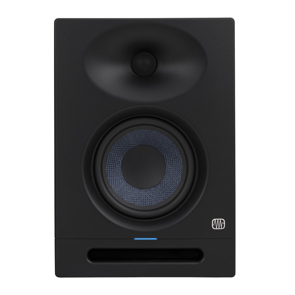 • 5.25-inch woven composite low-frequency driver • 1-inch, ultra-low mass, silk-dome, high frequency driver • Crossover Frequency 3.5 kHz • 120˚ x 60˚ EBM waveguide provides a sweet spot • Front-firing acoustic port for superior bass-frequency reproduction • 80W, Class AB dual amplification with 48 Hz to 20 kHz frequency response • XLR and 1/4-inch TRS balanced rear-panel inputs, RCA unbalanced rear-panel inputs, Introducing the Presonus Eris Studio 5 studio monitor speaker Building on the reputation of its award-winning predecessors, the Eris® Studio 5 is a substantial update that delivers richer low-end and more controlled high-frequency response that reproduces every detail in your recordings with a natural sound unparalleled in its class. Designed for superior performance in both home studio and small professional mix rooms, the Eris Studio 5 combines flexible connectivity with sonic accuracy that puts it a class all its own. Superior high-frequency response The custom-designed EBM (Elliptical Boundary Modeled) waveguide provides superior high-frequency response and wide 120-degree horizontal dispersion to create a broader sweet spot. Narrow vertical dispersion reduces reflections from your desk, and a silk-dome tweeter ensures snappy, accurate transient reproduction. An elegant new enclosure design improves the waveguide performance so you'll hear the finest details in your mix. Punchy, clear bass The woven-composite low-frequency driver offers Eris' signature tight, clear bass with plenty of punch. Its 80W of biamped power make the Eris Studio 5 more efficient than previous designs. The ported enclosure maximizes bass response and allows the Eris Studio 5 to reach down to an astonishing 48 Hz - without a subwoofer! Flexible input options let you connect almost any line-level source, from mixers to audio interfaces and more. You'll have no problem hooking your Eris speakers up to virtually anything.
