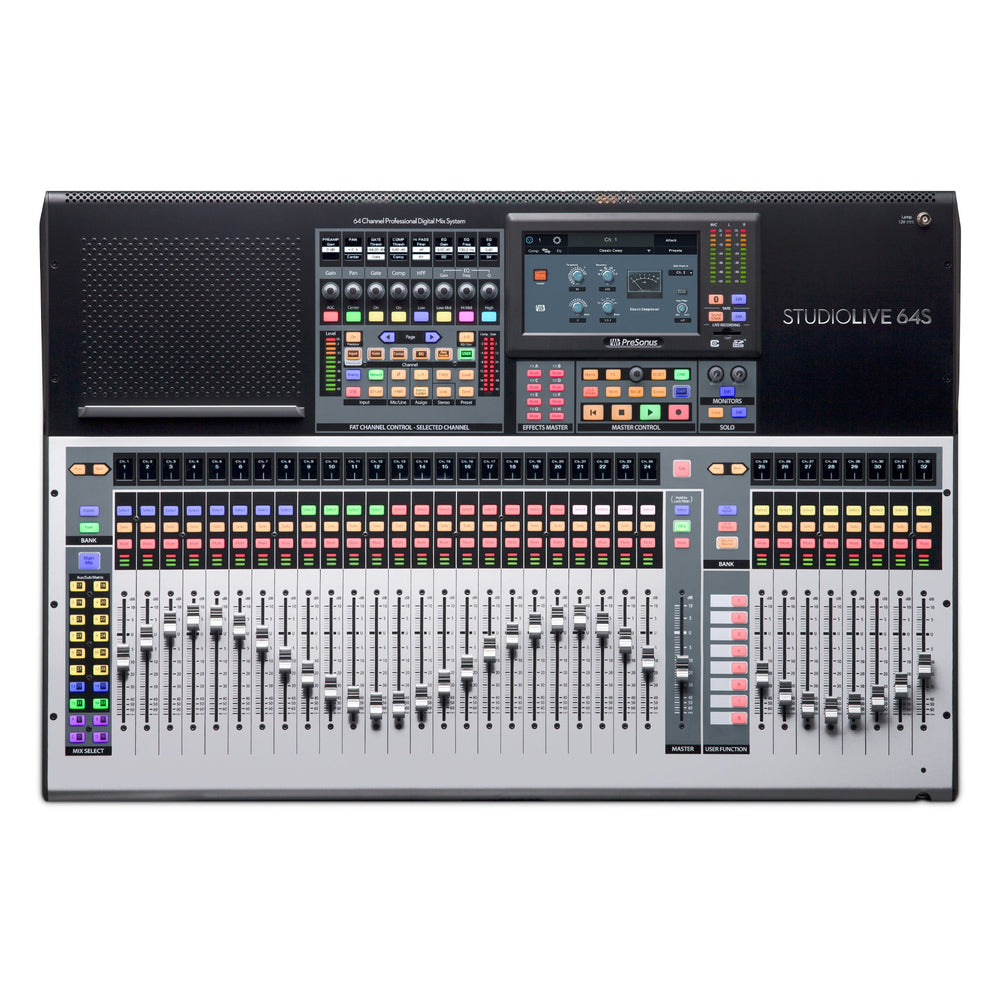 • Portable, flexible 64 channel digital mixer with a dual-core FLEX DSP Engine • Fully recallable, 38-input, 40-channel digital mixing console • 43 Mix buses: 32 FlexMixes (Aux-, Matrix-, or Subgroup- configurable), 8 FX Mixes plus LCR Main Bus • 33 touch-sensitive, motorized faders • FLEX FX multi-effects processor • Includes a full perpetual license for Studio One Professional V7, Introducing the PreSonus StudioLive series III 64S digital mixer - 64 channels The StudioLive 64S is a 64-channel mixer that brings the power of a large format console to small format digital mixing. Powered by the new quad-core PreSonus FLEX DSP Engine, the StudioLive 64S digital mixer is equipped with 76 mixing channels, 43 mix buses, and 526 simultaneous processors—including 8 stereo reverberation systems, and Fat Channel plug-in models on every input channel and mix bus. With 128 (64X64) channels of USB recording, 128 channels of AVB I/O, flexible routing options, and the studio-grade audio quality that made StudioLive mixers famous, the StudioLive 64S delivers a truly exceptional mixing experience that's in a class of its own. Whether you are mixing in the studio, or on a festival stage the Studio Live 64S is able to adapt to your needs. The perfect mixer for versatile sound engineers, production companies or any flexible venue. The best digital mixer for recording - with or without a computer PreSonus Capture® recording software is an intuitive multitrack recording application with a fully integrated Virtual Soundcheck mode that runs directly on your StudioLive 64S digital mixer or on your Mac® or Windows® computer. Record any combination of channels, FlexMixes, and the main stereo mix to USB, to an SD Card, or both for the ultimate redundant live recording rig. StudioLive mix scenes can be stored with your recordings to speed up Virtual Soundchecks. Best of all, Capture sessions open natively in Studio One® with the entire StudioLive mix scene re-created in the Studio One console, complete with fader levels, Fat Channel settings, mutes, solos, and more to launch your live mix right where you left it. Superior sound In 1995, PreSonus patented digital control over analogue circuits with thier first studio product. Building on this legacy, PreSonus created a separate digital volume-control circuit ahead of our lauded analog XMAX mic preamp design, providing the convenience of digital recall without sacrificing fidelity. This allows the StudioLive 64S mic preamps to be remote-controlled with UC Surface software or Studio One, and when you load a StudioLive 64S mixer scene, the mic preamp trim values can also be recalled along with the other settings. Create the buses and groups you need PreSonus designed the StudioLive 64S digital mixer to adapt to your changing needs, whether you’re mixing in the studio or on a busy festival stage. Its 32 FlexMixes can be individually configured to function as an aux bus, a subgroup, or a matrix mix. Eight designated effects buses plus stereo and mono main buses make a total of 43 mix buses in addition to an independent solo bus. We also provided 24 DCAs so you can more easily and flexibly control groups of channels. The independent Main Mono bus can be configured with individual channel sends to feed a subwoofer or as the center channel in an LCR system, complete with a Center Divergence control on each channel to more precisely place your pan positions. Reconfigure your mix without unplugging a cable StudioLive Series III digital mixers incorporate the concept of an analog patchbay and digitize it. This lets you patch any analog input or digital return (AVB, USB, or SD Card) to any channel to customize your mix configuration. This flexible feature also allows you to freely route audio to your AVB network and record any of the inputs and FlexMixes on the 64 USB sends. Digital Patching also makes it easy to quickly route to and source from your AVB audio network when using the StudioLive 64S as part of a complete networked audio system. Premium software package included The ultimate USB audio interface and control surface With 128 (64x64) channels of recording over USB, the StudioLive 64S is not just the best digital mixer for live sound recording; it’s the best digital mixer for the studio as well. Each channel can independently access its analog input or its dedicated digital return from your computer. While compatible with any DAW, Studio One and the StudioLive 64S are the perfect pair to elevate your studio recording environment. Remotely control your StudioLive 64S digital mixer’s recallable XMAX mic preamps and Fat Channel processing from Studio One Artist. Press the DAW button on your StudioLive 64S digital mixer and use the 33 touch-sensitive motorized faders to control your Studio One mix. World-class recording software included PreSonus Studio One® Artist DAW is included with the StudioLive 64S. Studio One seamlessly combines the time-tested and proven recording studio model with today’s beat- and loop-oriented production process so you can spend your precious time creating music instead of wondering what to click next. Remote control your digital mixer from anywhere PreSonus StudioLive Series III digital mixers are tightly integrated with an entire suite of state-of-the-art software. Mix wirelessly using UC Surface touch-control software for macOS®, Windows, iPad® and Android™. Control your monitor mixes with QMix®-UC for iPhone®, iPod® touch, and Android devices. Whether you’re adjusting monitor mixes on stage, moving around the room to dial in your mix, or using your mobile device as a second screen for your StudioLive 64S digital mixer, remote controlling your mix from anywhere just got easier. Fat Channel plug-ins bring your mix to life The dynamic Fat Channel on the StudioLive 64S digital mixer puts critical EQ and Dynamics functions beneath your fingertips while giving you fast access to every parameter. Fat Channel plu