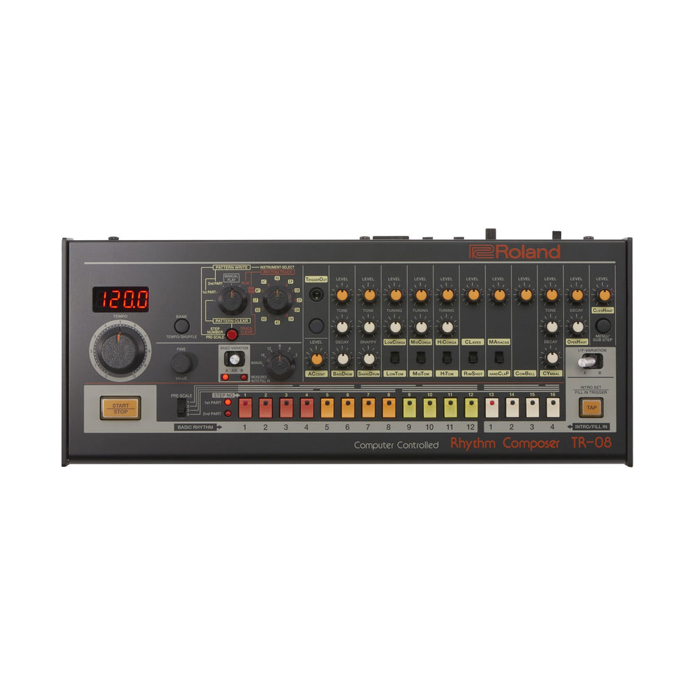 • Ultra-compact recreation of the legendary TR-808 drum machine • Hands-on control including tone, level, tuning, and decay • Added Compressor, Gain, Tune, and Pan for selected instruments • Sequencer has 16 steps with 16 sub-steps for detailed patterns and rolls • LED display for easier navigation and control • Battery-operated (4 x AA) or USB powered, Introducing the Roland TR-08 Rhythm Composer The TR-08 is an incredibly detailed, faithful replica of the legendary TR-808—the most famous and influential drum machine ever made. Beloved by musicians and producers around the world, it’s one of the most revered and sought-after electronic musical instruments of all time. The TR-08 brings the look, sound, and feel of the original 808 to Roland’s impressive musical repertoire, offering artists the same legendary boom and sizzle but in an affordable, modern format. The TR-808 legacy The TR-808 arrived in 1980, where it was picked up by adventurous musicians and producers, resulting in a sonic impact that changed the world of music forever. For the next three decades, the sizzling hi-hats and snappy snare, the robotic, clicky rim shot, the unmistakable cowbell, and iconic booming bass drum would be heard on many thousands of tracks. Worldwide hits, underground classics, and entire genres were spawned. Its influence is so deep that it’s been name-dropped in famous tracks, had albums dedicated to it and bands named after it, and even been the subject of a feature-length documentary film. The next generation of 808 The TR-08 adds some thoughtful and modern touches to the classic formula. The sequencer has 16 sub-steps per step, so you can create detailed snare fills and intricate, rolling hi-hats. It also has a track-selectable trigger out for working with other instruments like the TB-03, SH-01A, or modular gear. An unobtrusive LED display provides finer control of tempo and shuffle. You can also step-program or tap in your parts in real-time without stopping to change modes. Everything sends and receives MIDI control messages; it even supports audio and MIDI over USB! Sophisticated design in a portable package The original TR-808 is big and heavy, and its rarity makes it extremely expensive and sought-after on the used market. Because of this, many have resorted to 808 sample packs or hardware knockoffs. But there’s something about the controls and sound of a genuine TR-808 that makes so many classic tracks special. The TR-08 houses all the features that make the 808 so special. The interface, while miniaturised, is 100% authentic, and the sound is vibrant and alive. This is thanks to Roland’s proprietary Analogue Circuit Behaviour (ACB) technology, which has been used to carefully recreate all the details and quirks of the original hardware by modelling each analogue circuit, right down to the component level. The TR-08 is small enough to take just about anywhere. It’s ruggedly built with sturdy knobs, buttons, and switches. It has several tilt options for easy viewing in various live and studio scenarios. It can be a low-latency, portable audio interface. It even has a built-in speaker and runs on batteries. All this power and flexibility makes the TR-08 the perfect tool for musicians, wherever inspiration strikes. What's in the box? - Boutique Dock: DK-01 (Black) - Alkaline battery (AA, LR6) x 4