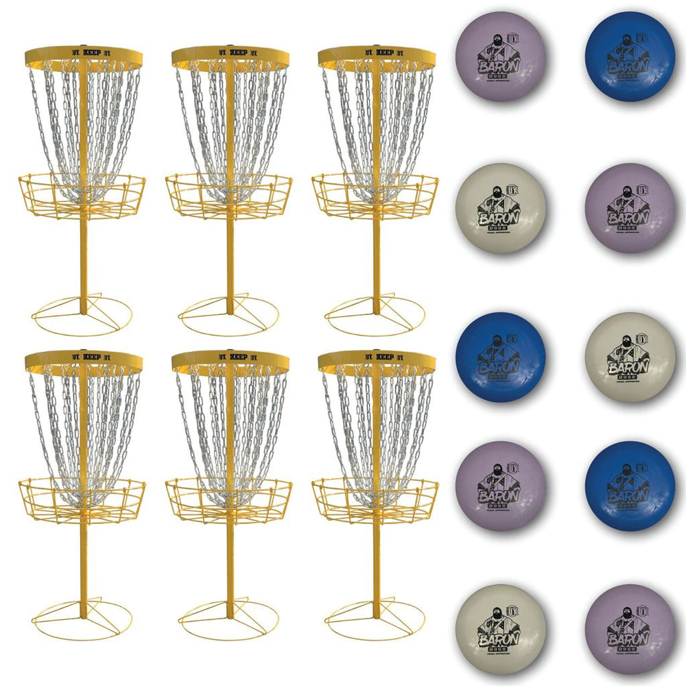The UK’s first portable Disc Golf basket. The baskets are lightweight and packs down for easy transportation. Offered in 3 versions including either 3, 6 or 9 Keep baskets and all include 10 discs.