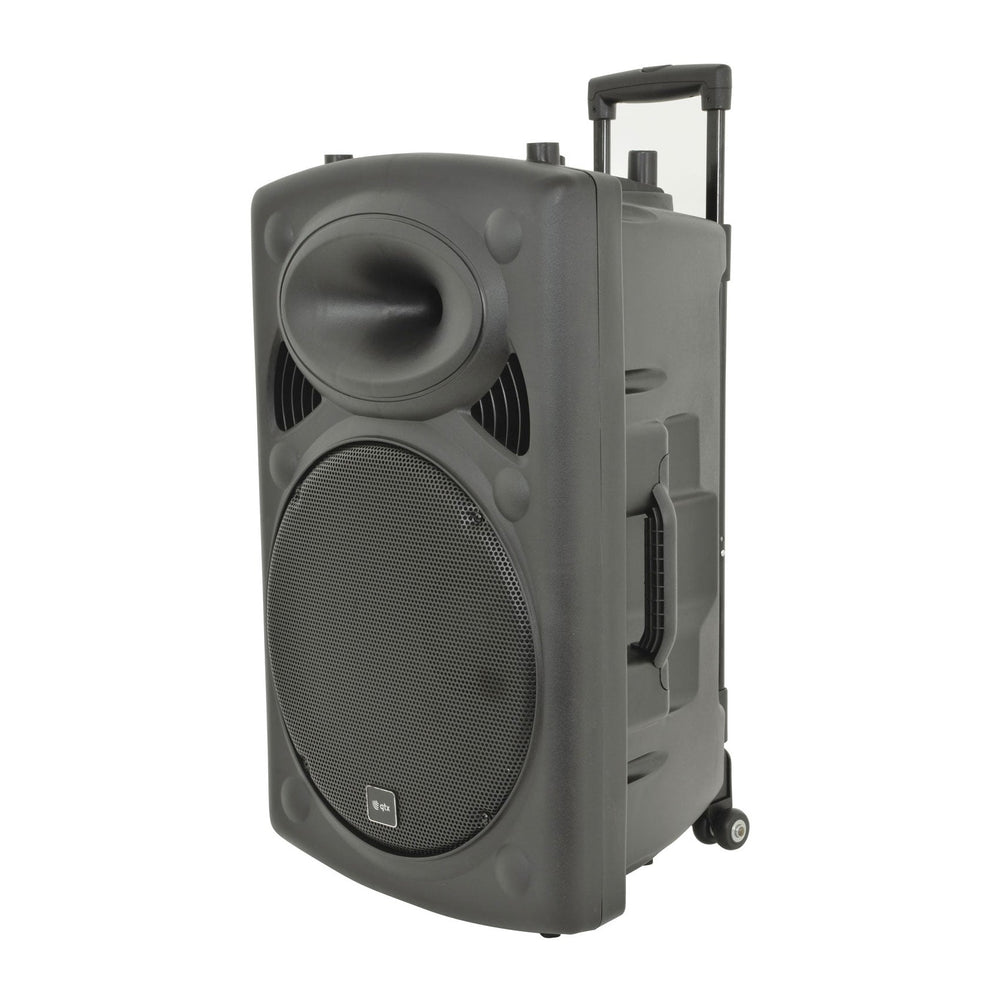 trolley-style wheeled portable PA unit with a top-mounted retractable pull handle and side-mounted carry handle. Perfect for easy transport. Versatile input options include 2 VHF wireless microphones (included) 2 further mic inputs (one can also be used for guitar), mini jack (for phones, tablets, laptops and mp3 players), and RCA in/out (ideal for DJs). An internal media player works directly from SD card or USB memory stick, and a switchable VCV ‘voiceover’ feature automatically lowers the volume of background music when the mics are used. A 35mm pole mount enables the unit to be used on a stand. Mains or internal battery power (up to 8 hours).The addition of the voiceover feature as well as the QTX QR PA's great sound and portability makes this the ideal choice for your event PA solution.What's in the box?QR series portable PA unit2 VHF wireless handheld microphonesMains power leadIR remote control for inbuilt media playerUser manual"