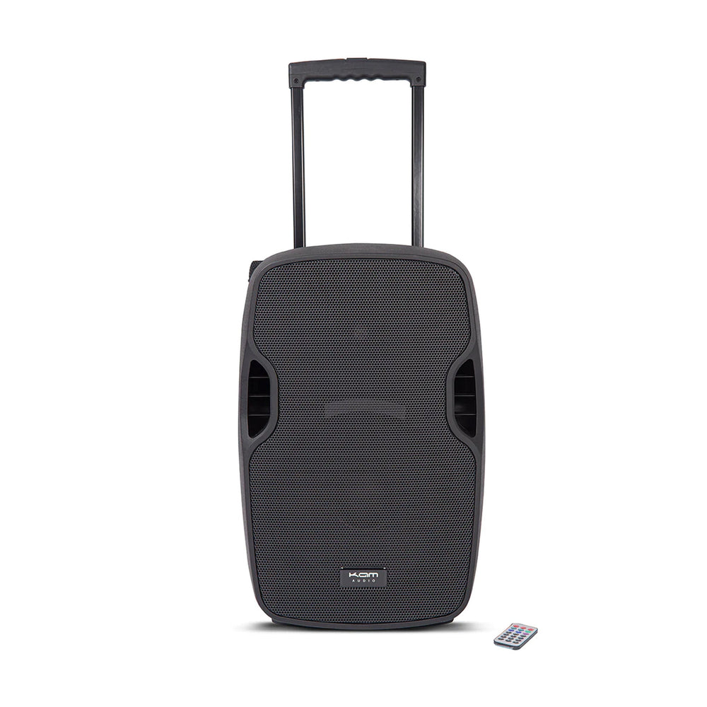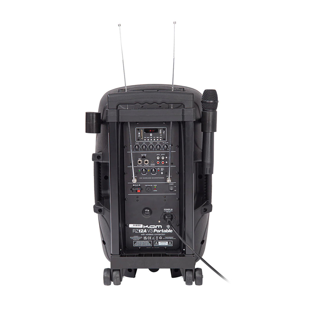 Introducing the KAM RZ12A PA speaker and microphone setA complete set including the KAM RZ12A speaker, a handheld microphone, a bodypack and headset microphone and USB and SD card input plus Bluetooth connection, meaning you do not have the hassle of wires.Great featuresThe KAM speaker features a 2x 6.35mm jack input for wired mics and instruments and a 3.5mm mini jack aux input for hard wired smartphones. There is also a RCA stereo line input for CD/MP3 players and a RCA stereo line mixed audio output along with a built-in heavy duty rechargeable battery.The power output of the speaker is 800w peak/ 400 RMS and the speaker comes with a master 2 band equalisation and a complete VFH wireless system built into the PA unit.The high versatility and variety of features means this speaker is ideal for music and dance lessons, parties and events, vocalists and singers, and public speakers.Great transportabilityFeaturing a telescopic handle, trolley wheels built directly into the unit and foldable aerials, this speaker is easy to transport and pack away.Complete portable PA system with MP3 / WMA / WAV media player, USB & SD card input, Built in VHF dual microphone wireless system, with dual aerials and RF indicators, Stream music straight from smartphones, tablets etc to the unit via Bluetooth, 6.3mm jack inputs for wired mics and guitars/instruments, Supplied with 1 x handheld & 1 x headset VHF wireless mics