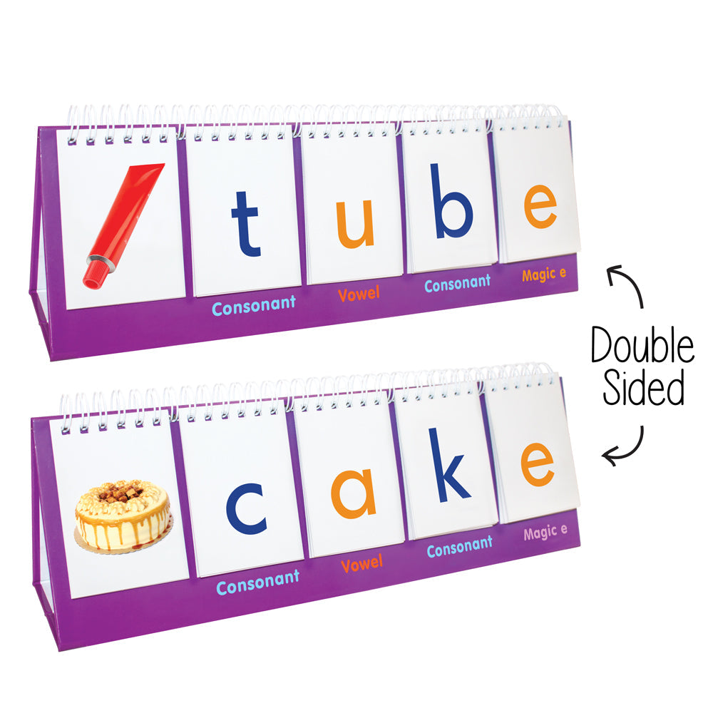 Magic E Flips is a double-sided flip stand for teach the split digraph (or magic e). Photographic images are included to provide word building examples. Spell new words by flipping over pages and show how the final 'e' makes the short vowel say its name. Learn Magic E with a double sided flip stand Teach the split digraph (or magic/silent e)Flip over the pages to build new wordsPhotographic images used throughout.Show how the final 'e' makes the short vowel say its name1 x flip stand