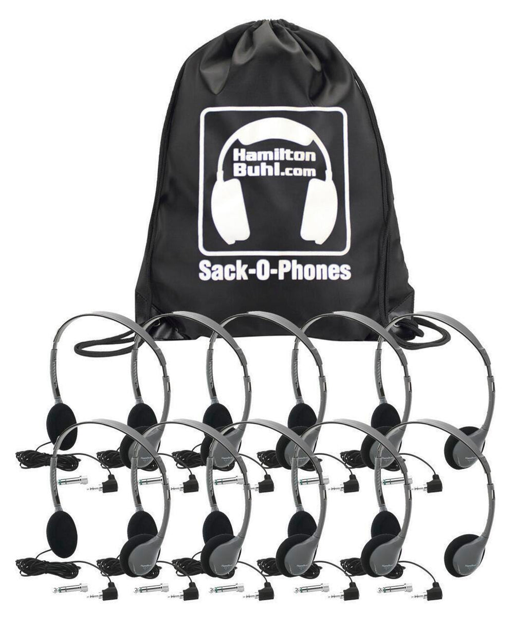 HamiltonBuhl Sack-O-Phones Headphones with Carry Bag, Gray, Pack of 10