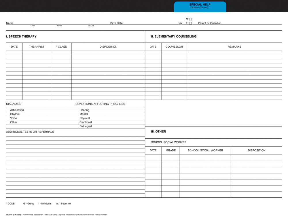 Hammond & Stephens Cumulative Record Special Help Insert, Blue, Pack of 25