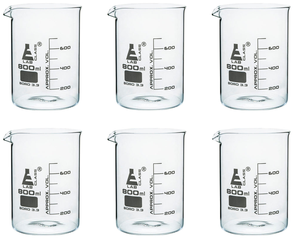 Eisco 800mL Borosilicate Glass Beakers with Spout, Low Form, Pack of 6