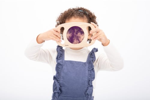 Solid rubberwood frame with easy hold handles enclosing a panel of sparkling glitter in purple, silver and gold. The panels can be twisted and turned to make the glitter liquid move and flow in fascinating ways. Ideal for sensory discovery and broadening descriptive vocabulary.
