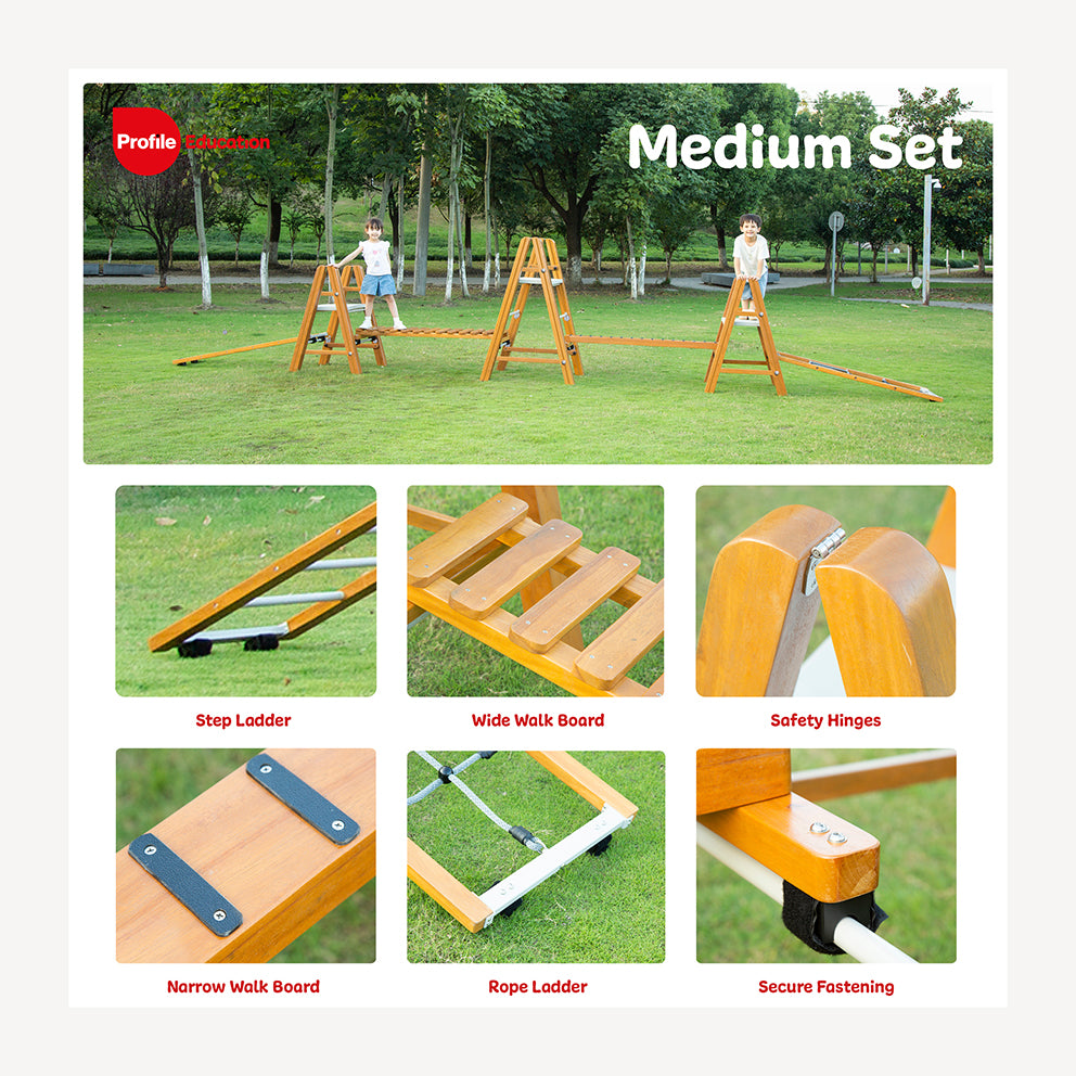 Our exploration challenge courses are a fun and exciting activity for your children and a great way for them to learn and develop whilst undertaking physical exercise. As your children encounter each obstacle, different senses and actions are triggered – engaging different parts of the brain in critical thinking as they seek to overcome the next challenge and make their way to the safety of the platform area – where they can contemplate their next moves. Children will explore movement and balance challenges and develop fine and gross motor skills as they climb, balance, crawl, bend or stretch around the course. Kids will develop a huge sense of pride, confidence, and accomplishment as they complete the exploration challenge course. Our medium set includes 7 pieces – 3 trestles (1 high/2 low), 1 step ladder, 1 rope ladder, 1 narrow and 1 wide walk board. Supplied flat packed with simple assembly instructions. , Raw Materials: Manufactured from a highly durable sustainable wood that is suitable for external use without ongoing preservative treatment. Climbing rails are made from rust resistant galvanized steel and platforms are manufactured from robust plastic – with a high tensile strength and resistance to harsh environments. , Dimension : 1345 x 7200 x 760 , Age range : Ages 3+