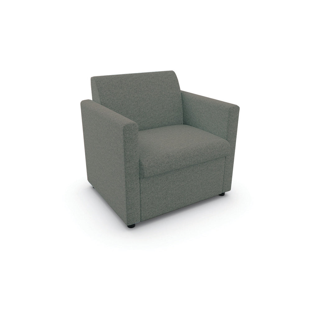 A fully upholstered armchair, with a fixed seat cushion, and black nylon feet. Ideal for reception areas, staff rooms, and breakout spaces.