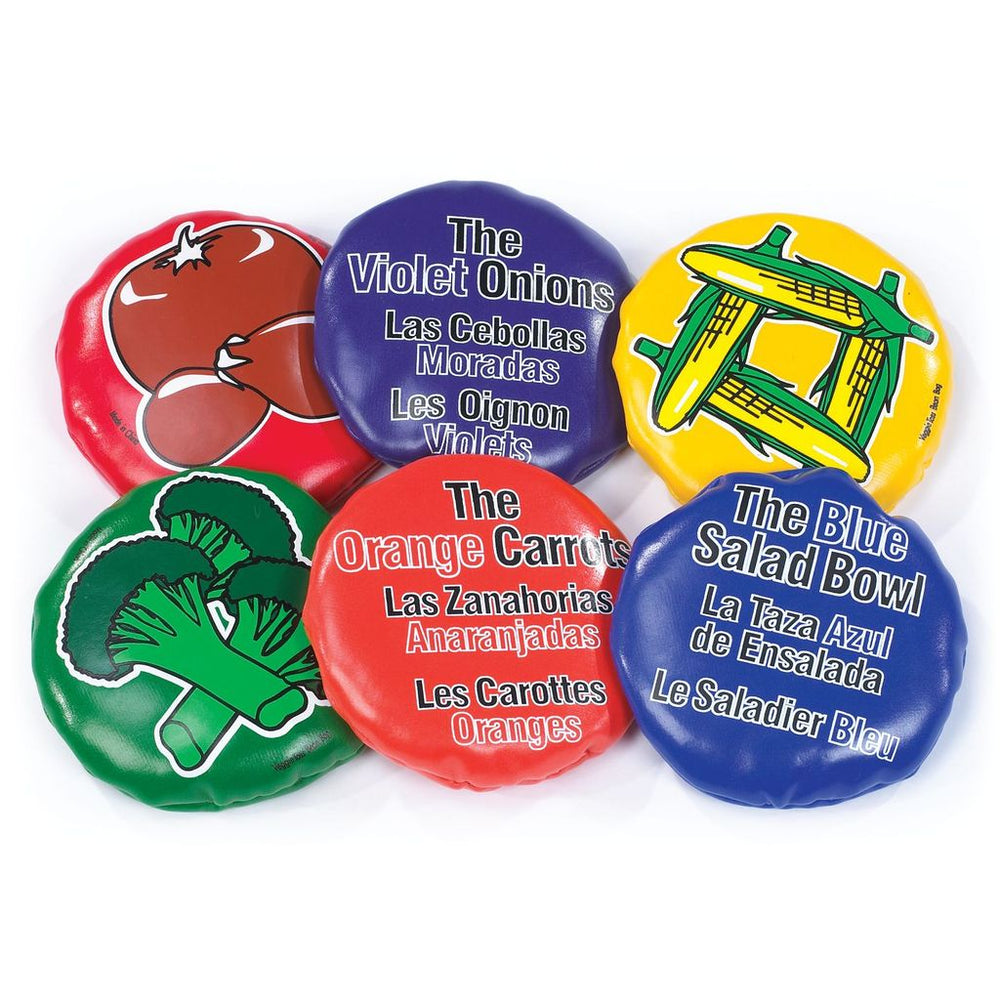 Cross curricular Vegetable Bean Bags with a discrete healthy living theme. The round, easy to catch vinyl bean bags have an image of either a vegetable pictured on one side while on the reverse the description is shown in English, French and Spanish. The Bean Bags feature Blue Salad Bowl, Green Broccoli, Orange Carrot, Red Tomato, Yellow Corn and Violet Onion. Dia. 11cm.