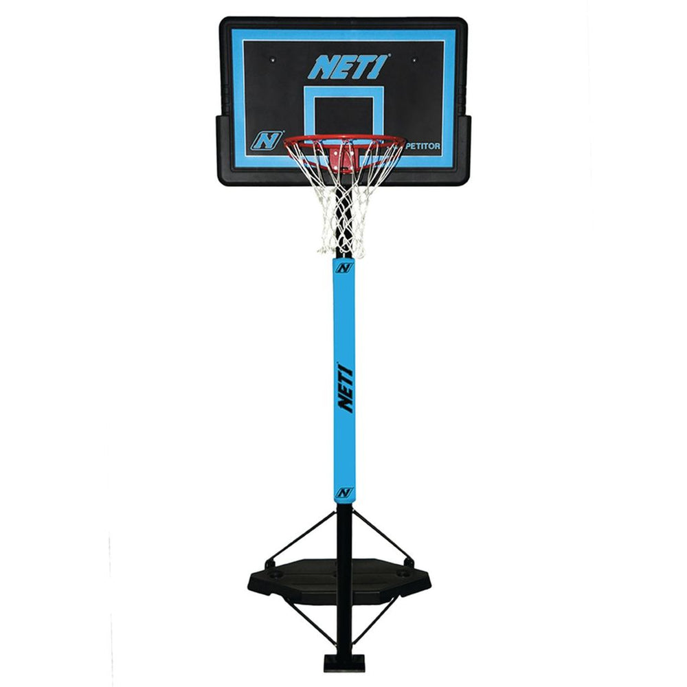 71cm H), with UV inhibitors and T-bar support. Solid steel ring dia. 45cm with all-weather 12 loop net. Three piece powder coated pole (dia. 7.6cm). A 38 litre moulded base fillable with sand or water. Two rear facing wheels for easy manoeuvrability. Protective pole padding included.