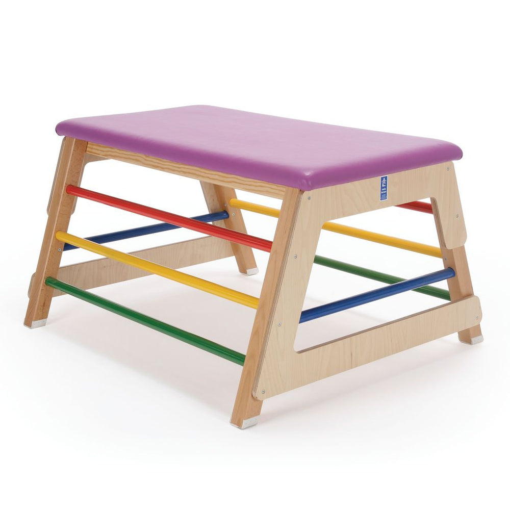 The Multicoloured Junior Bar Box is designed to appeal to younger users and features wooden uprights, brightly coloured steel bars and a comfortable padded vinyl top. Top size: 124 L x 64cm W. Height 68cm.