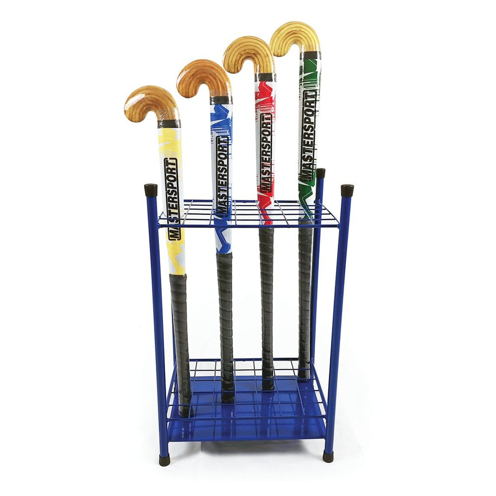 Freestanding powder coated steel hockey stick rack, which can hold up to 35 hockey sticks.