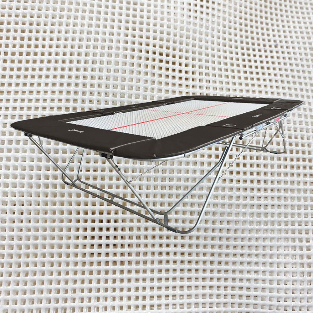 The most popular model for schools. Supplied complete with fixed roller stands, coverall pads and steel springs. Available with 3 bed types; 13mm web, 25mm web or solid super mesh (which can be wiped clean with anti-bacterial spray). In use size: 4.6 L x 3. W x 1m H. Optional Lift/lower stands available and a tear resistant, flame retardant polyester reinforced PVC Protective Cover.
