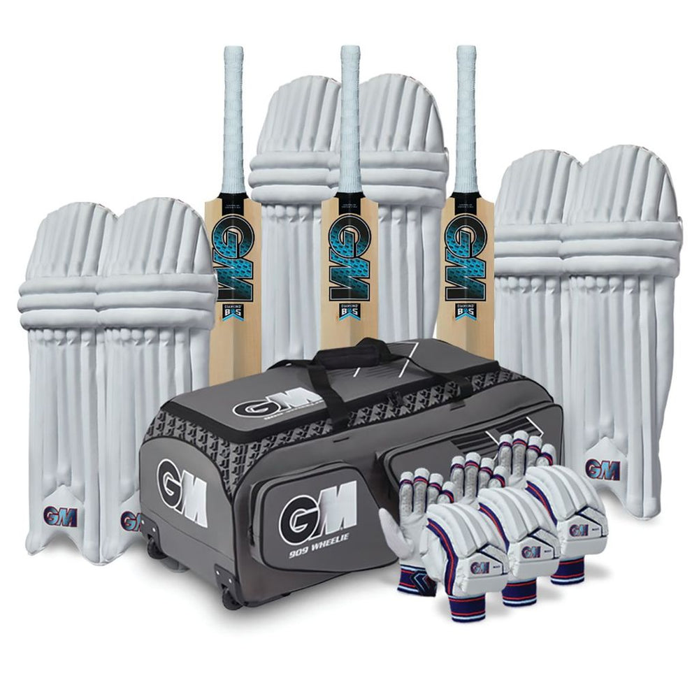 Ideal Cricket Class Set contains 3 pairs of ambidextrous Batting Pads, 3 pairs of righted handed Batting Gloves, 3 Short Handled Grade 1 Kasmir Willow Bat and a wheeled Cricket holdall.