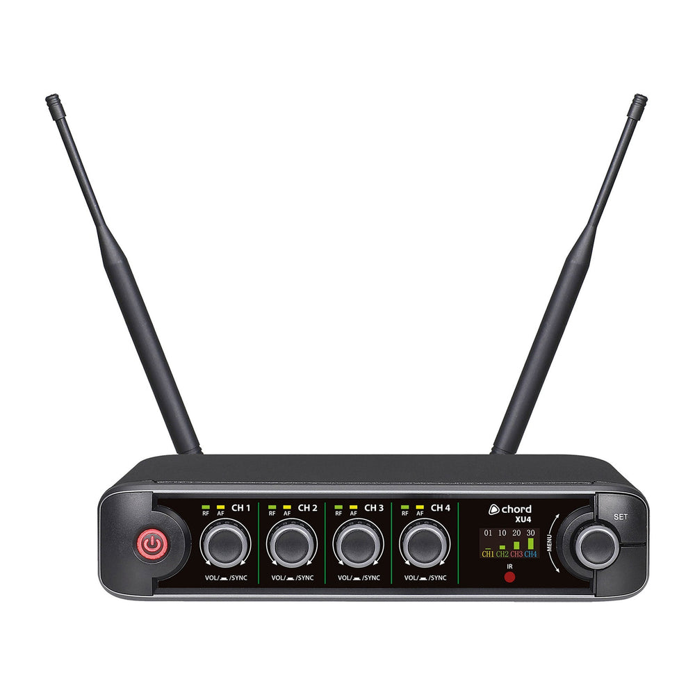 • Compact half-width rack receiver • True diversity antennas with internal distro for reliable reception • 10 groups of 9 selectable UHF carrier frequencies • Selectable backlight colours for each channel • Settings sync I.R. from receiver to transmitters • Colour TFT display for settings menu, Introducing the Chord XU series UHF wireless microphone systems XU series wireless microphone systems offer pro-level features in a compact receiver with premium microphone transmitters. Supplied as a half-width 1U rack receiver with 1, 2 or 4 channels of either handheld microphones or bodypack transmitters with a neckband and lavalier mic option. The receiver is a true diversity type with dual antennas and internal distribution for minimising dropouts. The front panel has a volume control and indicator LEDs per channel alongside a colour TFT display with level indications for each channel and settings for channel frequencies and colours. Each transmitter also has its own LCD display for frequency and battery status, with a backlight that can be set to one of 6 colours for identification. Carrier frequencies are arranged in 10 groups with carriers in both the UK/EU license-free UHF and PMSE licensed duplex gap UHF bands. Each set is supplied with hardware for mounting into a 1U rack space with extension cables to enable front mounting of the antennas. For a wireless microphone system with straightforward operation and intuitive features, the XU series delivers freedom and reliable operation to vocalists, presenters and instructors in a compact and convenient package. What’s in the box? - XU-series true diversity UHF receiver - 1, 2, or 4 bodypack transmitters with neckband & lavalier mics - 2 x UHF antennas - 2 x BNC antenna extension leads - Rack-mounting brackets for 1 or 2 receivers in a 19" 1U space - UK power adaptor - 6.3mm male to male cable - 2, 4, or 8 x AA batteries