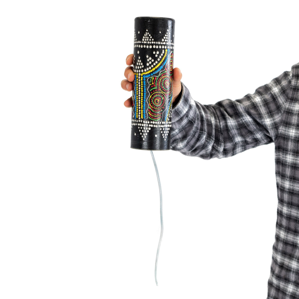 Introducing the Percussion Plus Honestly Made Thunder shaker These thunder shakers from the Percussion Plus Honestly Made range produce an incredibly accurate representation of thunder. Use the larger size for a deeper rumble and the smaller for a higher pitched, less intense storm. The thunder shakers are hand made in Bali and are all hand painted with colourful storm scenes using the dot painting style. Lightweight and easy to play, these are fun for all ages and are a great instrument for anyone from schools to orchestras. These thunder shakers are sourced using Fair trade principles and are supplied in two sizes. See below for more information about the Honestly Made range of musical instruments from Percussion Plus. These items are musical instruments not toys and there may be small parts on or in some of them. Younger players should use them under supervision. Experiment with your own sounds To play, hold the tube section and shake to produce the sound of thunder and the faster you shake, the more intense the storm sounds. Experiment with the sound – hitting a pencil against the metal spring whilst shaking produces a metallic tone, like a train going through a tunnel. See what sounds you can make! A variety of uses Thunder shakers are a fun stimulating tool for the classroom and can be played by anyone. They not only produce a stimulating sound for young children, but they are also used as sound effects in many contemporary orchestral pieces and sound recordings. Crafted in Bali using traditional materials and methods, Hold the drum with the spring down and shake gently to hear the sound of thunder, Hand painted clouds and lighting design, Also known as a spring drum, Responsibly sourced,