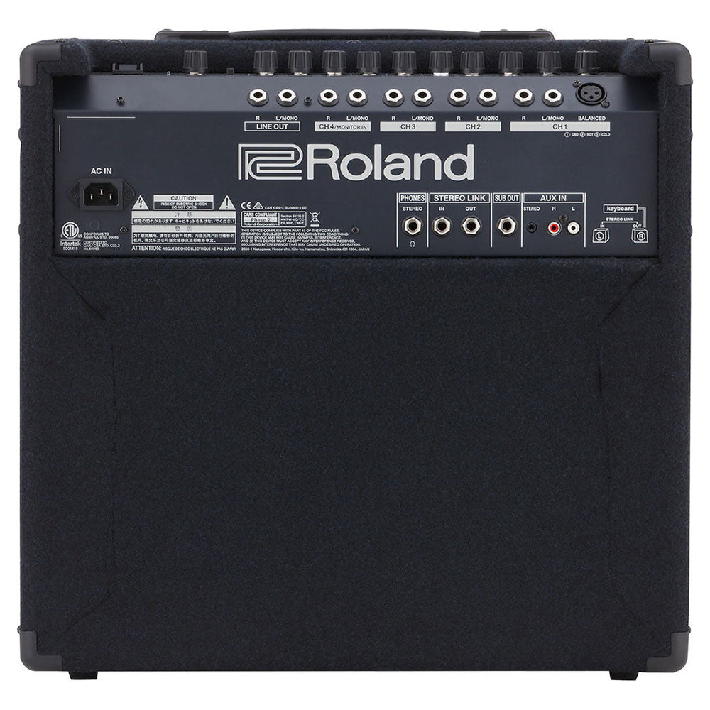 Introducing the Roland KC400 150W keyboard combo amplifierBuilding on the success and popularity of the previous model KC350, the new KC400 offers 30 extra watts of power while remaining neat, compact and easily transportable. It incorporates a newly designed 12 inch custom woofer cone in order to produce a richer sound quality, and the power section has been rethought to improve stability and enhance the bass reproduction.Full-range soundOffering a powerful, punchy sound and full-range audio reproduction, the KC-400 is a compact amp with 150 watts of power. The cabinet features Roland's patented twin bass-reflex design, providing extended low-frequency response without distortion.With its redesigned power section, the KC-400 delivers great bass performance for amplifying 88-note stage pianos, organs, and synthesizers, plus rhythm machines and other electronic instruments. On top of all this, this efficient power section is also reduced weight, making the KC-400 easy to carry from gig to gig.Onboard stereo mixingWith the KC-400's four line input channels, it's easy to connect keyboards, percussion pads, drum machines and more. There is also a dedicated auxiliary input where you can plug in a smartphone or music player for backing tracks. The line and aux inputs support stereo connections, meaning you can send stereo sound to a PA or recording device and amplify in stereo when connecting to a second KC-400 through Stereo Link. Channel 1 also includes an XLR input, allowing you to plug in a vocal mic for even more versatility. Plus, with the convenient Output Select function on Channel 4, there's a lot of flexibility for monitoring click and guide tracks while performing.Versatile connectivityWith its easy-access connectivity, the KC-400 integrates onto any playing environment. Stereo line outputs are provided on 1/4-inch jacks for interfacing with PA systems, stage monitors, and recording devices. There's also a Sub Out jack for connecting to a powered subwoofer, with level conveniently tied to the amp's master volume for one-touch control. The KC-400 has a headphones jack as well, which is perfect for silent practice sessions and discrete stage monitoring.Expand setup with Stereo LinkWith the KC-400's Stereo Link function, it's simple to expand your inputs or monitor in stereo. When you connect to the two stereo link jacks on another KC-400, the number of available inputs double. Plus, the left and right signals of connected stereo instruments are split across the two amps, meaning it is possible to bring a studio-like monitoring experience to you stage performance setup.Compact and versatile keyboard amp, Features improved bass reproduction, reduced weight, and increased stability, Includes metal jacks for more durability, XLR mic input, 1/4-inch line outputs, sub output, Output select function on Channel 4 for monitoring click and guide tracks, Headphones output
