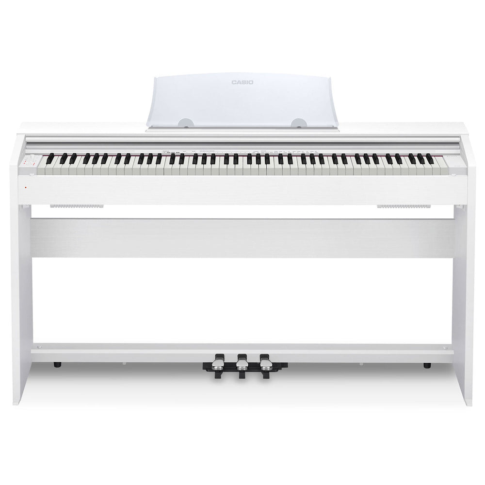 Introducing the Casio Privia PX-770 digital pianoThe PX-770 offers an excellent specification for its price, with a realistic piano sound and authentic key touch that is certainly the best at its price point. It shares the same Tri Sensor Scaled Hammer Action II keyboard with the more expensive Celviano and Privia instruments along with the same AiR sound engine so there is no compromise on playability, and its slimline and simplistic cabinet makes it an ideal choice for those with limited space and budget.It is compatible with Casio's new Chordana tuition app to make learning fun, along with the built-in Concert Play songs to learn, making it attractive to the beginner pianist while the action and sound quality will satisfy those somewhat more advanced.Available in a black high quality cabinet, an integrated stand, keyboard cover and 3 pedal system, the PX-750 will look good in any room. The all new Tri-Sensor Scaled Hammer Action Keyboard II, and the extraordinary quality of the new Multi-Dimensional Morphing AiR Sounds Source ensure a piano experience that is truly stunning. With its new concert play feature, you can play along with an orchestra on 10 well known orchestral pieces.Multidimensional Morphing AiR Sound SourceThe characteristics of Casio’s newly developed Multidimensional Morphing AiR* Sound Source reflect thorough attention to detail in expressing the rich, resonating tones inherent to the piano. The capacity of the installed memory has been expanded to achieve a longer sampling duration and enhanced waveform data quality. The temporal changes in tone that create sound you would expect only from a piano, beginning with the initial sound and leading into a beautiful extension until the sound eventually vanishes, are reproduced naturally.* AiR = Acoustic and Intelligent ResonatorTri-sensor Scaled Hammer Action Keyboard IIThe difference between the sound structures of a grand piano and a digital piano appears as a difference in timing, from the moment the instrument is played until the sound is audible. The new tri-sensor Scaled Hammer Action Keyboard II responds by incorporating a system with three sensors that detect touches of the keys sequentially.The simulated ebony and ivory keys offers the luxurious feel and texture as well as the smooth touch of a grand piano keyboard. The minutely detailed crimp surface finish inhibits finger slippage due to sweat and gives the sensation of a perfect fingertip fit, even when playing for extended periods.An improved sound engine with a new improved European grand piano sound, Available in either satin black or satin white finishes, Chordana tuition system app for iOS and Android devices, Great value and ideal for the aspiring pianist, Mid-range Casio Privia slimline digital piano with incorporated stand and 3 pedal unit, Realistic feeling ebony and ivory feel keyboard, fully weighted and graded
