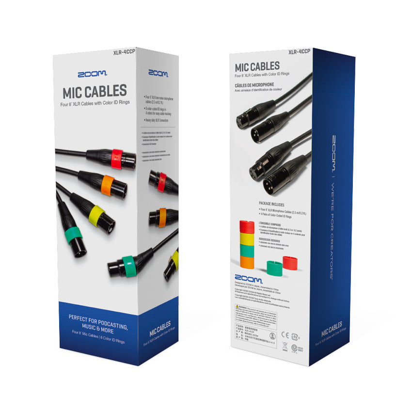 Introducing the Zoom XLR Mic cables with colour ID ringsPerfect for podcasting, music and more. Having enough cables is key for any recording project. The XLR-4C-CP includes 4 low noise microphone cables with heavy duty XLR connectors The 4 pairs of colour-coded rings (8 rings total) helps you to easily identify which mic is going into each channel.Includes 4 8' low noise microphone cables with heavy duty XLR connectors (2.5m / 8.2ft), 4 pairs of colour-coded (8 rings total) to easily identify which mic is going to which channel, Perfect for podcasting, music and more, , ,