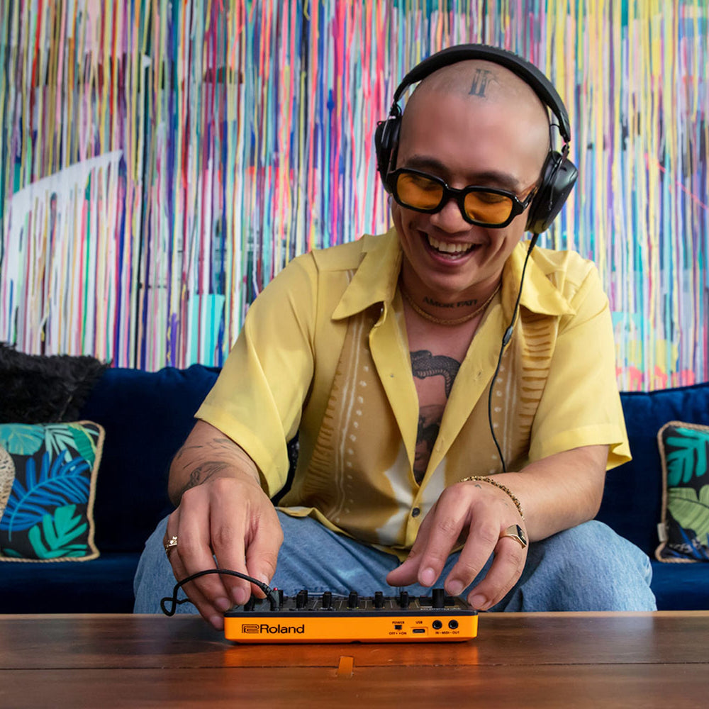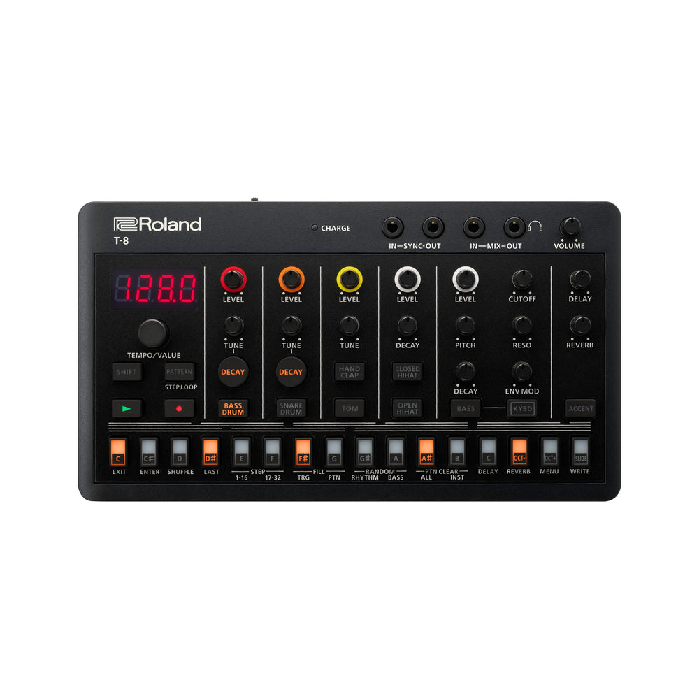 Introducing the Roland Aira Compact T-8 Beat machineCreate new, infectious tracks in seconds flat with the T-8 beat machine, a miniature rhythm factory featuring the legendary Roland TR drums plus bass from the inimitable TB-303. Great for use at home and in the studio, the compact T-8 is designed to make creating beats and rhythms as simple as possible, wherever you are.Loaded with comprehensive I/O, the T-8 is ready to be the rhythmic centrepiece of any electronic music setup. You can connect and sync with other AIRA compacts such as the J-6 Chord Synthesizer and E-4 Voice Tweaker. You can also interface with computer DAWS, mobile music apps, as well as hardware instruments via MIDI or USB-C.The T-8 contains amazing features such as six rhythm tracks with sounds from the influential TR-808, TR-909 and TR-606 drum machines, real time recording with powerful features like step loop, mute, fill, reload and pattern shift, along with advanced rhythm programming with probability, step loop, last step and velocity. A modernised workflowBacked by the TR-REC step sequencer loved by beatmakers since the 1980s, the T-8 makes it simple to develop ideas without having to stop the action. Featuring real-time recording, sub steps, and velocity, the T-8 provides great programming power at your fingertips. With features such as step-loop, pattern shift and probability, it is easy to deliver dynamic performances while constantly evolving your sound. Authentic bass experienceWith the T-8 you can experience an authentic bass experience, including the tactile power to squeeze, squelch and mangle sounds in the moment. Record notes, accents and slides with traditional step-based input or play in parts live with the bottom-row buttons or an external MIDI keyboard. Features 7 tracksThe T-8 features six drum tracks and one bass track all brought together on an intuitive interface making fast recording and hands-on tweaks easy. With the T-8 you can capture and fire off 64 patterns with up to 32 steps each, shaping sounds and control parts as you go. Highly portableRugged and built to last, the ultra-compact T-8 is designed to be highly transportable, meaning you can create music wherever and whenever you please. The lithium-ion battery also keeps you going for up to 4.5 hours per charge. Connect with other AIRA compactsComplementing each other perfectly, use the four AIRA compacts in conjunction to achieve the ultimate, flexible set up and workflow. Dive into a new world of sonic textures and sound design with the E-4 Voice tweaker, bring harmonic substance to your jams with the J-6 Chord synthesizerand dive into a new word of sonic textures and sound design with the S-1 Tweak synthesizer.Ultra-portable rhythm and bass machine with excellent sounds and effects, Classic TR-REC drum sequencer with 64 user patterns and up to 32 steps each, Advanced rhythm programming with probability, sub step, last step and velocity, Features 6 rhythm tracks with sounds from the TR-808, TR-909 and TR-606 drum machines, Comprehensive connectivity with audio, MIDI and sync I/O plus AIRA link, Lithium-ion battery with up to 4.5 hours of operation per charge