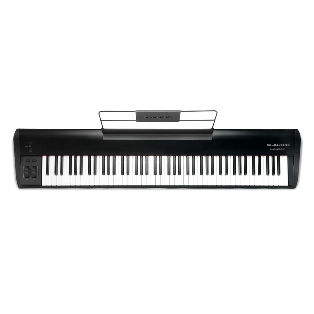 Introducing the M-Audio Hammer 88 USB MIDI KeyboardIdeal for beginners or students, this keyboard is great for someone who is looking for a realistic grand piano feel to use with virtual instruments or sound modules. The 88 velocity-sensitive keys are fully-weighted and hammer-action that are guaranteed to faithfully capture every subtle nuance of your performance.With the classic feel of a grand piano fused with the sonic capabilities of virtual instruments this keyboard will provide you with the unmatched response. It's the perfect combination for performers and producers to experience their plugin collection like never before.Features for expressive playingThanks to a core range of controls your performance will be enhanced and your expression will be put centre-stage. Portamento and glissando effects can be added with the unity-locking pitch wheel and a separate modulation wheel. There are other features such as the master volume fader so the intensity of your performance can be controlled instantly or MIDI mapped to any parameter in your DAW or virtual instrument collection for expanded, hands-on control.If you wanted to take things further, you can also add some pedal-based performance articulation using the three dedicated inputs for sustain, expression and soft.Make the most out of your external sound generatorsDon't limit yourself to your computer-based virtual instruments. You can use it's conveniently located 5-pin MIDI output, you can send all MIDI information to any compatible peripheral device, including hardware synthesisers, sound modules and drum machines.With the Hammer 88 it is easy to get the most out of your playing and gives you complete control when it comes to music production and performance.A USB MIDI controller built for playing virtual instruments, controlling recording software and more, 88 fully-weighted, hammer-action keys, Pitch bend, modulation, volume and ± controls for expressive performances, Multiple keyboard zones for layering, splits and 4-note chords with a single key press, 5-pin MIDI output and three dedicated inputs for sustain, expression and soft, Includes music rest, Hammer 88 controller editor and premium software suite