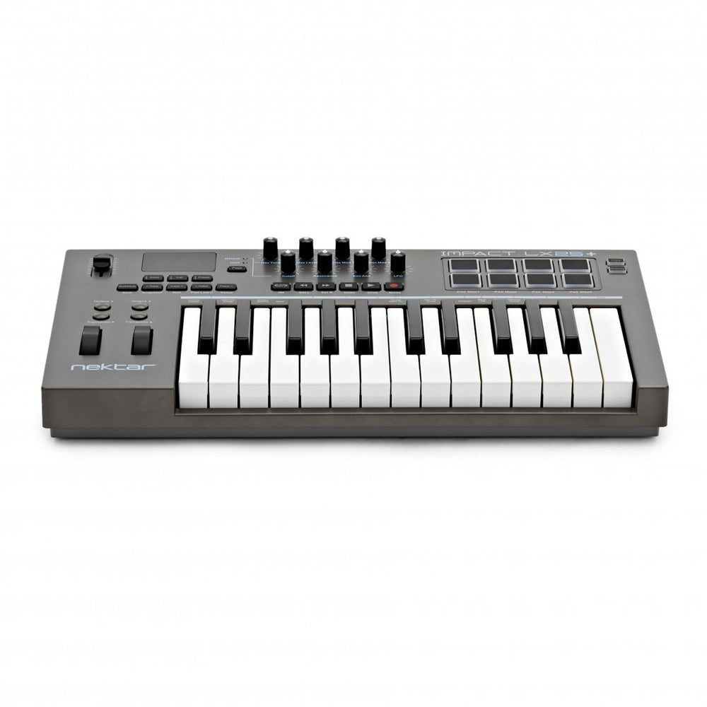 Introducing the Nektar Impact LX25 MIDI controllerThe Impact LX25+ MIDI controller is compact, portable, and packed with intelligent and expressive performance controls. It connects automatically to your DAW software with the Nektar DAW integration which has been designed specially for a variety of production software including Cakewalk, Cubase, FL Studio, GarageBand and many more.The keyboard has 25 velocity sensitive keys which are covered to protect them against dirt and dust as well as complimenting the Impact LX contemporary design. With features like octave and transpose buttons, pitch bend and modulation wheels, you can quickly shift your keyboard up or down as needed, or simply apply additional articulation with the wheels.Advanced octave and transpose buttonsThere is more to the 4 octave and transpose buttons than meets the eye. You can make important changes at any time using the 4 functions that are selectable on the fly. A key combination makes assignment fast and simple.You can send out MIDI program messages, change the Global MIDI channel or select any of Impact LX25+'s 5 user profiles using these buttons.An advanced control centreAt the centre of the control panel there is a 30mm fader and 8 pots. Each control is fully programmable to send any MIDI CC message for use with hardware or software MIDI products.There is also the possibility for you to switch Null on, any parameter values are stored when you change pre-sets to avoid parameter jumping.LED illumination padsFor beat creation, there are 8 velocity sensitive pads which will make your music creation process very easy. They are calibrated to trigger at a light touch and they have a very even velocity response.Assignments are stored over power cycling so you don't lose your settings when you switch you system off. The "pad learn" feature also allows you to select a pad then play the note or drum sound you want on the keyboard.Bitwig 8-track software includedBitwig 8-track is an effective digital audio station that helps musicians start producing, performing and designing sounds. There's a large selection of instrument sounds and effects to choose from with up to 8 project tracks with audio or MIDI. Artists are able to play and record instruments, produce arrangements and design sounds with the help of the Impact LX series.25 velocity sensitive keys, DAW integration, 1 30mm fader, 6 dedicated transport buttons, 8 velocity sensitive pads, Pitch bend & Modulation wheels