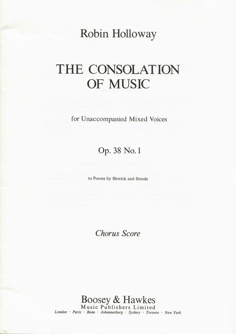 The Consolation of Music has a protracted history. I was first introduced to the enchanting poem by William Strode (1600-45) around 1965, and set its final stanza as a sort of chorale on September 9th 1966. In December 1971 I returned to it, adding the first two stanzas – the first as a reduced version of the original chorale on lower voices, the second as a free backwards-version on women’s voices. This complete setting was performed by the BBC Singers in 1975.But the chorale alone was a bit unleavened; it still needed something else. In the summer of 1977 I was re-reading Herrick; the frequency of his poems commending the soothing powers of music reminded me of the Strode. I made a little pattern from one poem (To Musique, to becalm his fever) set off by couplets from other poems whose titles I now forget. The women sing the whole; the men frame and punctuate with lines addressing music or women, not distinguishing very sharply between them; then both sexes exchange couplets in praise of love. The new section forms an introduction to the complete setting of the Strode, with its two plain stanzas, low then high, and the final full chorus with a luscious three-part descant for the sopranos.Robin Holloway, , , , ,