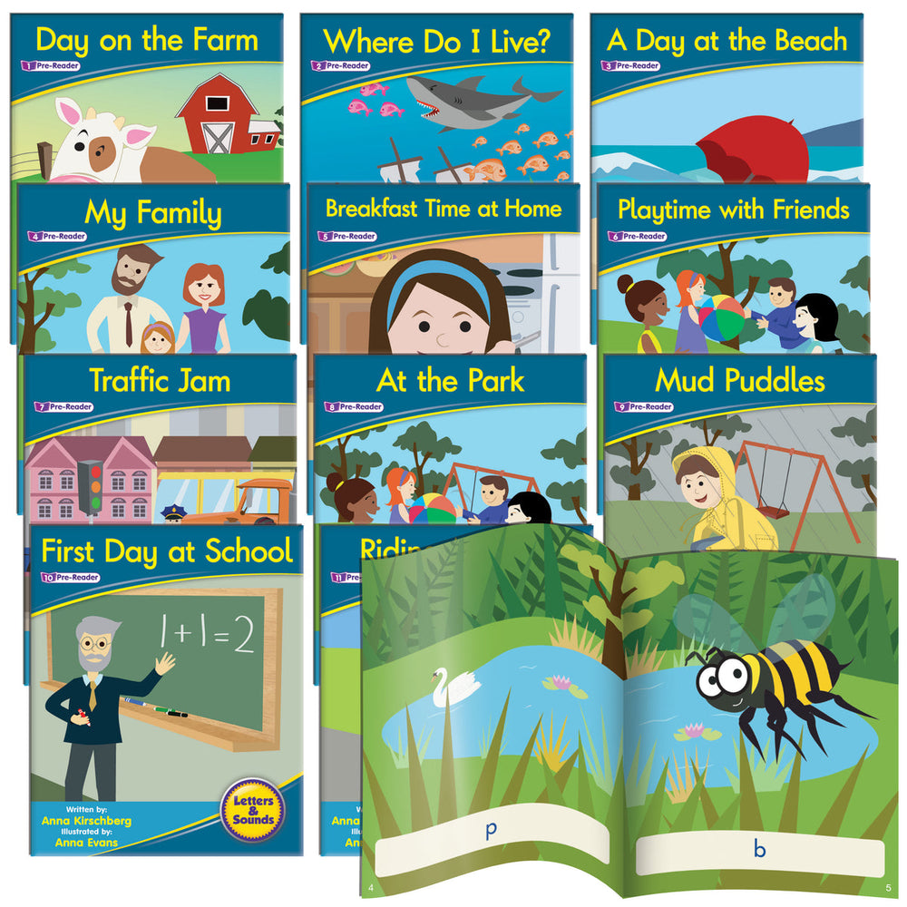 Each phonemic awareness readers introduces 8 different letter sounds (phonemes).These readers have been designed for teaching phonemic awareness at the shared reading level. Letters presented in each text can be read by teachers using their phoneme sounds (i.e. ssss for letter S). Phonemic awareness is an understanding that words can be broken into small units of sounds. Set includes 12 fiction readers, each with colorful illustrations. 12 Fiction readers Introduces 8 different phonemes (letter sounds)Listen to the sounds preparation page.Repetitive text.Bright, colorful illustrations.12 x books