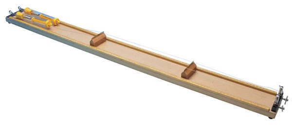 Comprising a wooden baseboard 98 x 9cm mounted on four feet. At one end of the base are two 50N spring balances with hooks, and at the other end are two corresponding wrest pins. Also provided are three bridges, one large to span both wires and two small for the individual wires.