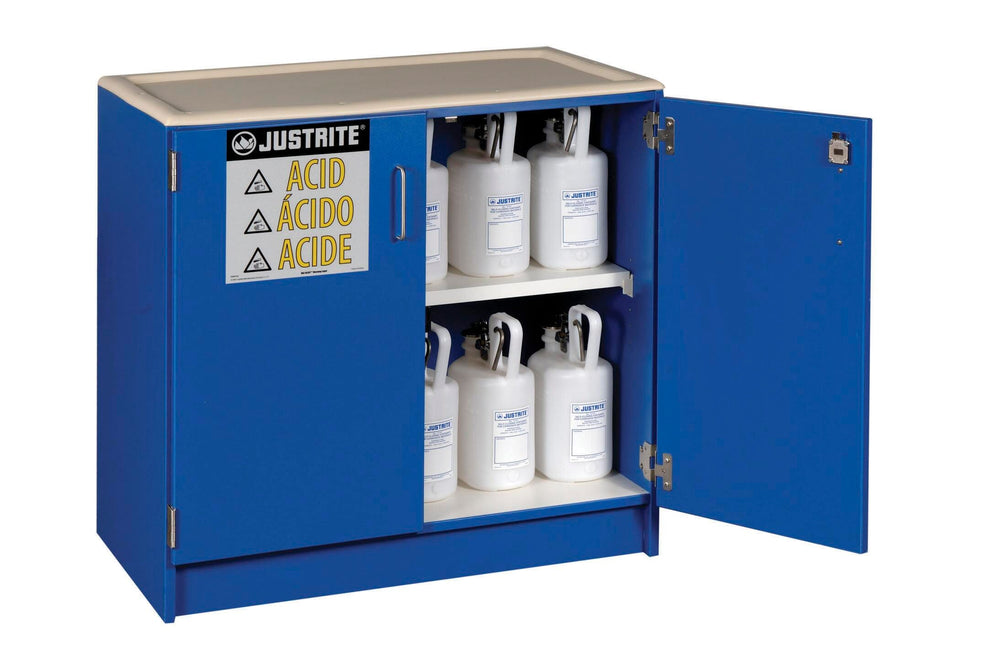 Justrite Corrosive Storage Cabinet, 36 x 22 x 35-3/4 Inches, 23 Gallon, Wood, Blue