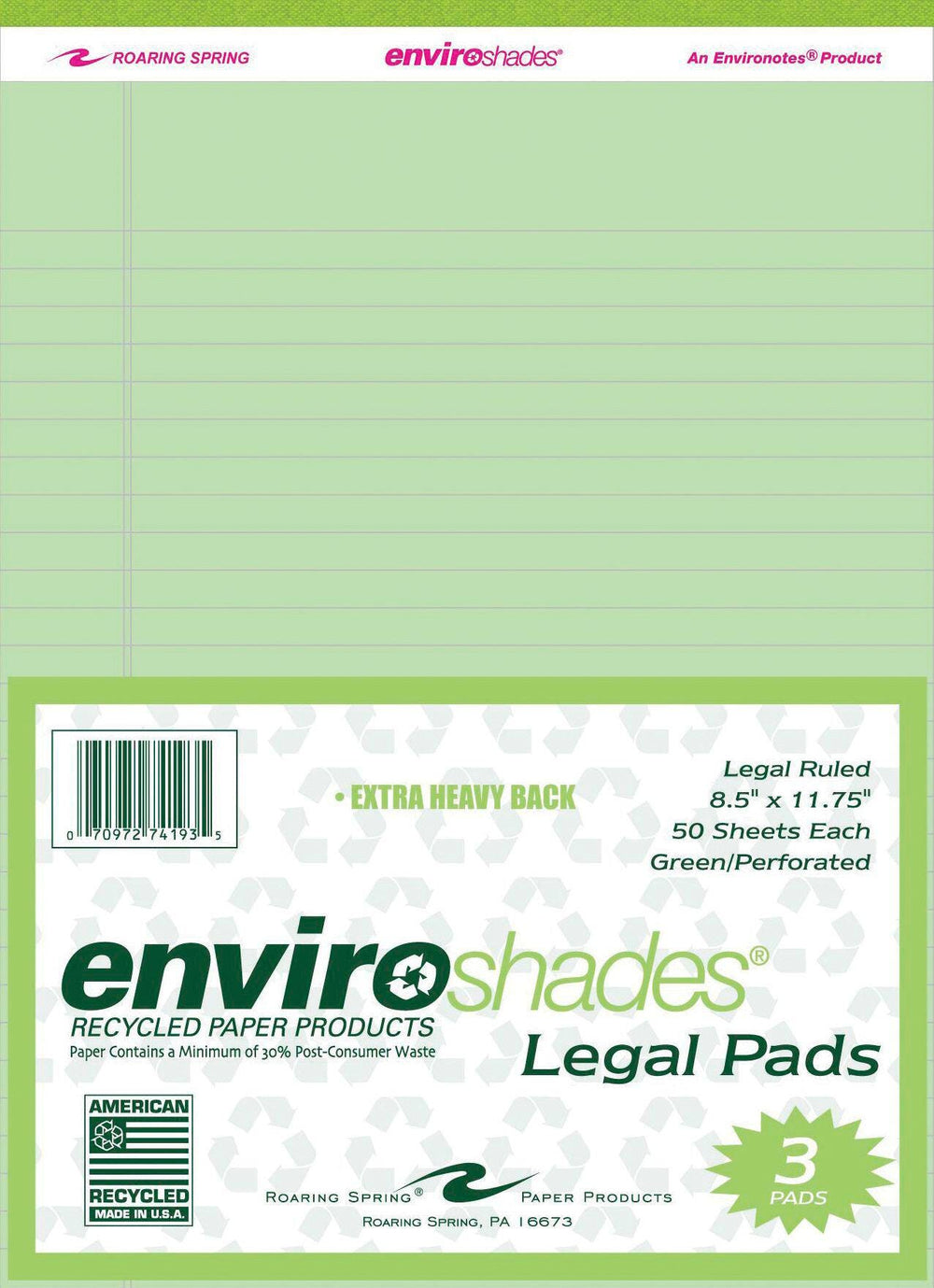 Enviroshades Legal Pads, 8-1/2 x 11-3/4 Inches, Green, 50 Sheets, Pack of 3
